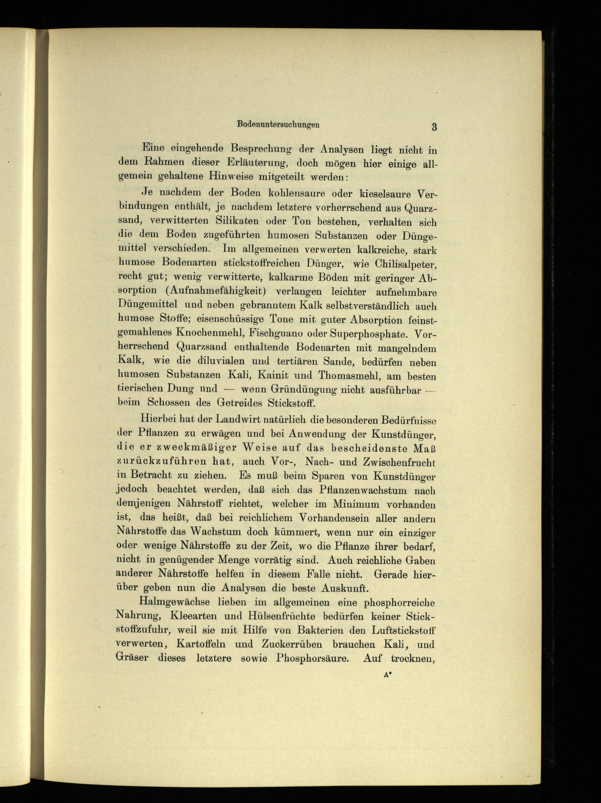 Je nachdem der Boden kohlensaure oder kieselsaure Verbindungen enthält, je nachdem letztere vorherrschend aus Quarzsand, verwitterten Silikaten oder Ton bestehen, verhalten sich die dem Boden zugeführten humosen Substanzen oder Düngemittel verschieden. Im allgemeinen verwerten kalkreiche, stark humose Bodenarten stickstoffreichen Dünger, wie Chilisalpeter, recht gut; wenig verwitterte, kalkarme Böden mit geringer Absorption(Aufnahmefähigkeit) verlangen leichter aufnehmbare Düngemittel und neben gebranntem Kalk selbstverständlich auch humose Stoffe; eisenschüssige Tone mit guter Absorption feinstgemahlenes Knochenmehl, Fischguano oder Superphosphate. Vorherrschend Quarzsand enthaltende Bodenarten mit mangelndem Kalk, wie die diluvialen und tertiären Sande, bedürfen neben humosen Substanzen Kali, Kainit und Thomasmehl, am besten tierischen Dung und— wenn Gründüngung nicht ausführbar-— beim Schossen des Getreides Stickstoff.