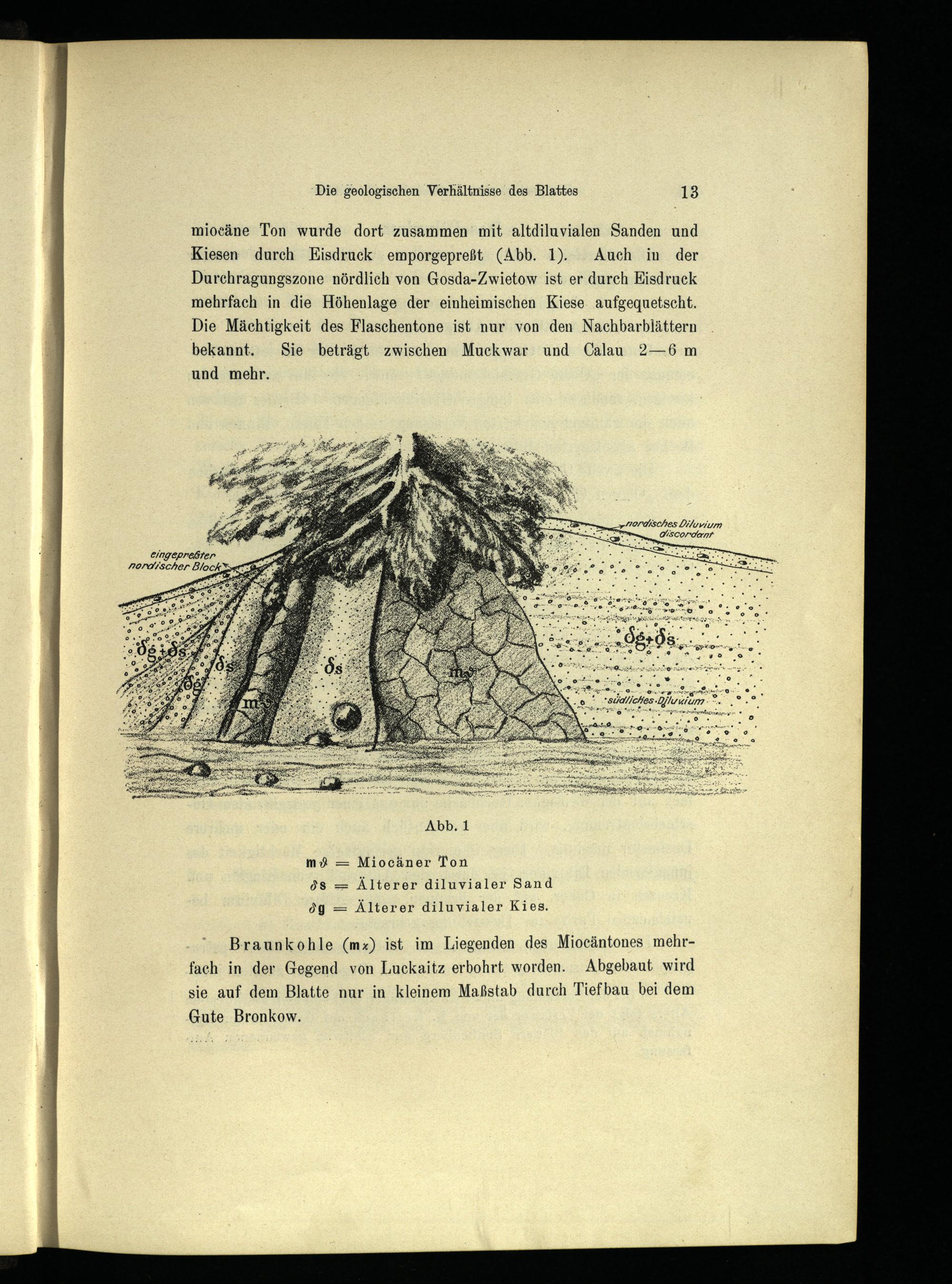 miocäne Ton wurde dort zusammen mit altdiluvialen Sanden und Kiesen durch KEisdruck emporgepreßt(Abb. 1). Auch in der Durchragungszone nördlich von Gosda-Zwietow ist er durch Eisdruck mehrfach in die Höhenlage der einheimischen Kiese aufgequetscht. Die Mächtigkeit des Flaschentone ist nur von den Nachbarblättern bekannt. Sie beträgt zwischen Muckwar und Calau 2—6 m und mehr.