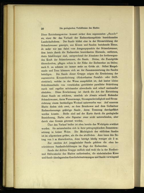 Diese Entstehungsweise kommt sicher dem sogenannten„Sandr“ zu, einer für das Vorland der Endmoränengebiete bezeichnenden Landschaftsform. Der Sandr bildet eine in der Stromrichtung der Schmelzwasser geneigte, aus Kiesen und Sanden bestehende Ebene, Je mehr wir uns dabei vom Ausgangspunkte der Schmelzwasser, dem heute durch die Endmoräne bezeichneten Eisrande, entfernen, desto feinkörniger sind, entsprechend der Abnahme der fortbewegenden Kraft der Schmelzwasser, die Sande. Steine, die Faustgröße überschreiten, pflegen schon in der Nähe der Endmoräne zu fehlen; nach S. zu nehmen sie immer mehr an Größe ab. Selbst Mergelsande und Tone könnnen sich an der Zusammensetzung des Sandrs beteiligen. Die Sande dieser Gruppe zeigen die Erscheinung der sogenannten Kreuzschichtung(diskordanten Parallel- oder Driftstruktur), welche in der Weise ausgebildet ist, daß lauter kleine Schichtenabteile von verschieden gerichteter paralleler Schichtung rasch und regellos miteinander abwechseln und scharf aneinander abstoßen. Diese Erscheinung ist durch die Art der Entstehung dieser Sande zu erklären, nämlich als Absatz schnell fließender Schmelzwasser, deren Wassermenge, Stromgeschwindigkeit und Strom: richtung einem beständigen Wechsel unterworfen war. Auf unserem Blatte finden sich zwei, zu dem Bronkower und dem Gollmitzer Endmoränenzuge gehörige Sandr, deren Trennung durchgeführt werden konnte. Beide sind auf der Karte durch die geologische Bezeichnung, Farbe oder Signatur zwar nicht unterschieden, aber durch eine Grenze getrennt worden.