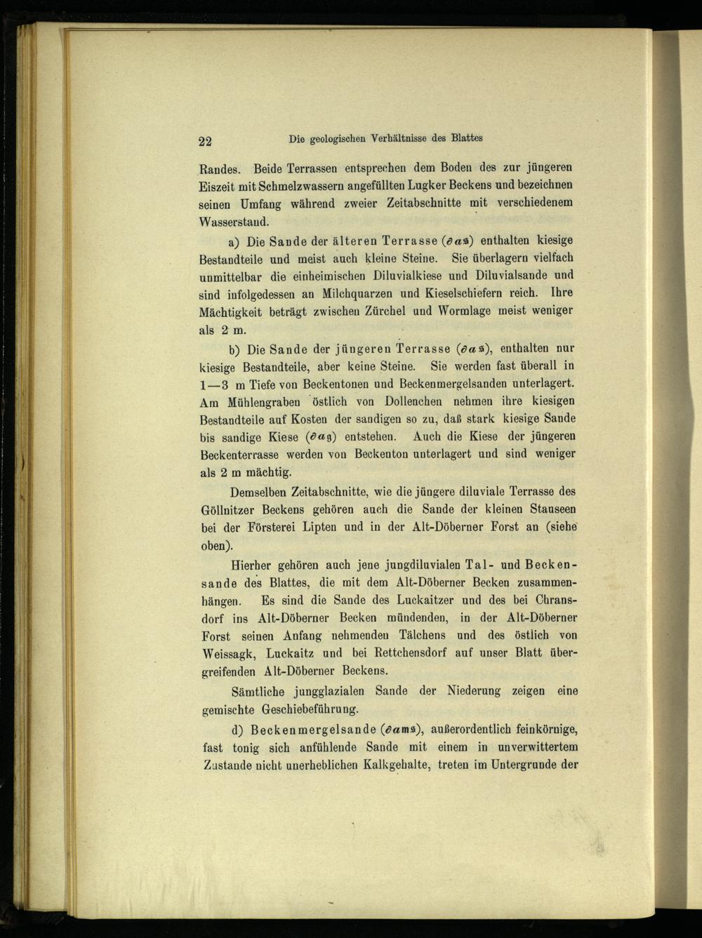 d) Beckenmergelsande(öam&), außerordentlich feinkörnige, fast tonig sich anfühlende Sande mit einem in unverwittertem Zustande nicht unerheblichen Kalkgehalte, treten im Untergrunde der