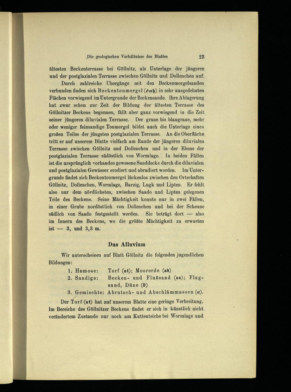 Wir unterscheieen auf Blatt Göllnitz die folgenden jugendlichen Bildungen: 1. Humose: Torf(at); Moorerde(ah) 2. Sandige: Becken- und Flußsand(as); Flugsand, Düne(D) 3. Gemischte: Abrutsch- und Abschlämmassen(a). Der Torf(at) hat auf unserem Blatte eine geringe Verbreitung. Im Bereiche des Göllnitzer Beckens findet er sich in künstlich nicht verändertem Zustande nur noch am Kuttenteiche bei Wormlage und