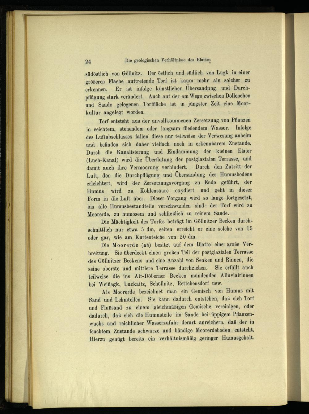 Die Moorerde(ah) besitzt auf dem Blatte eine‘ große Verbreitung. Sie überdeckt einen großen Teil der postglazialen Terrasse des Göllnitzer Beckens und eine Anzahl von Senken und Rinnen, die seine oberste und mittlere Terrasse durchziehen. Sie erfüllt auch teilweise die ins Alt-Döberner Becken mündenden Alluvialrinnen bei Weißagk, Luckaitz, Schöllnitz, Rettchensdorf usw.