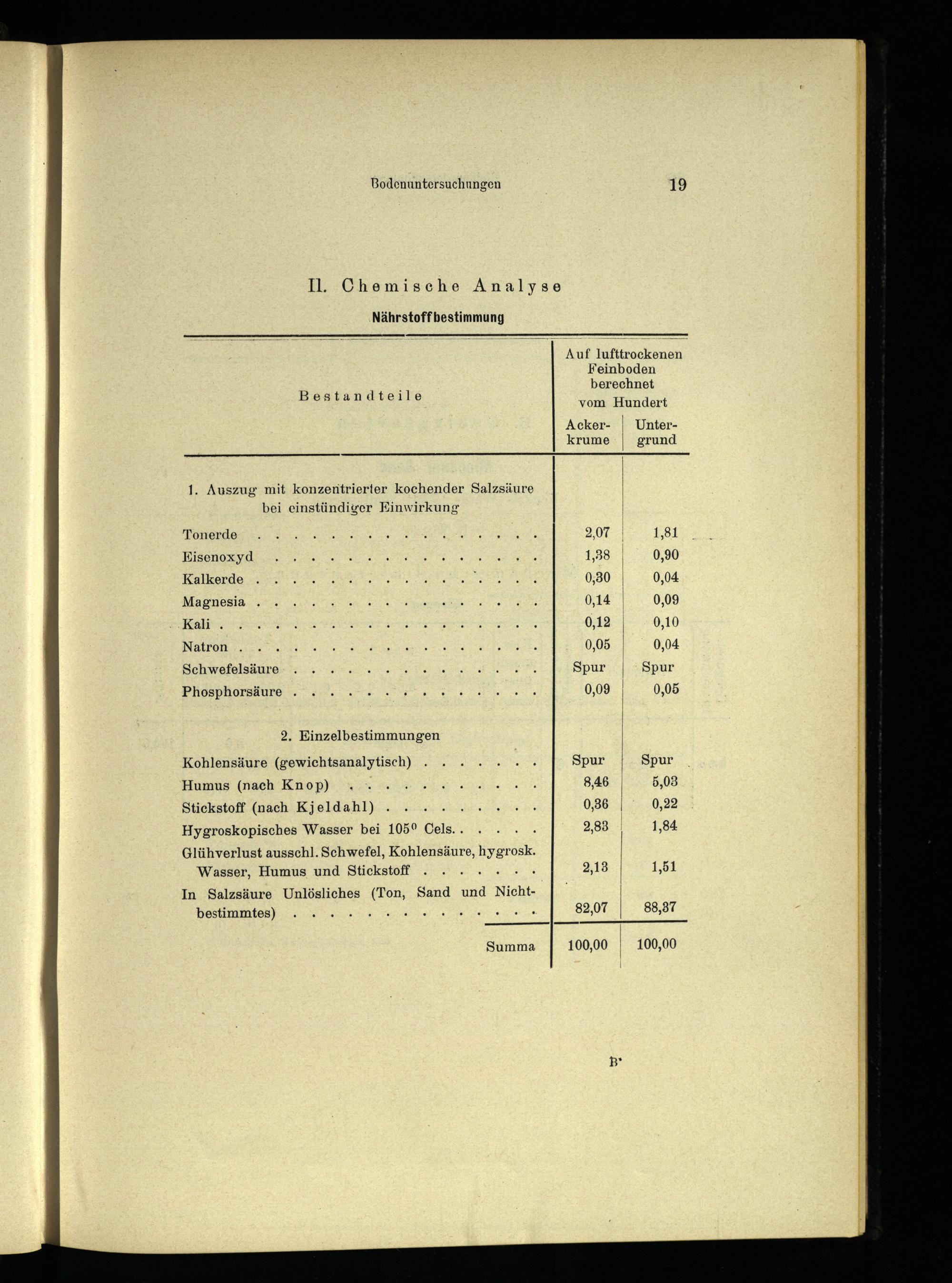 Wasser, Humus und Stickstoff.....+ 2,13 In Salzsäure Unlösliches(Ton, Sand und Nicht