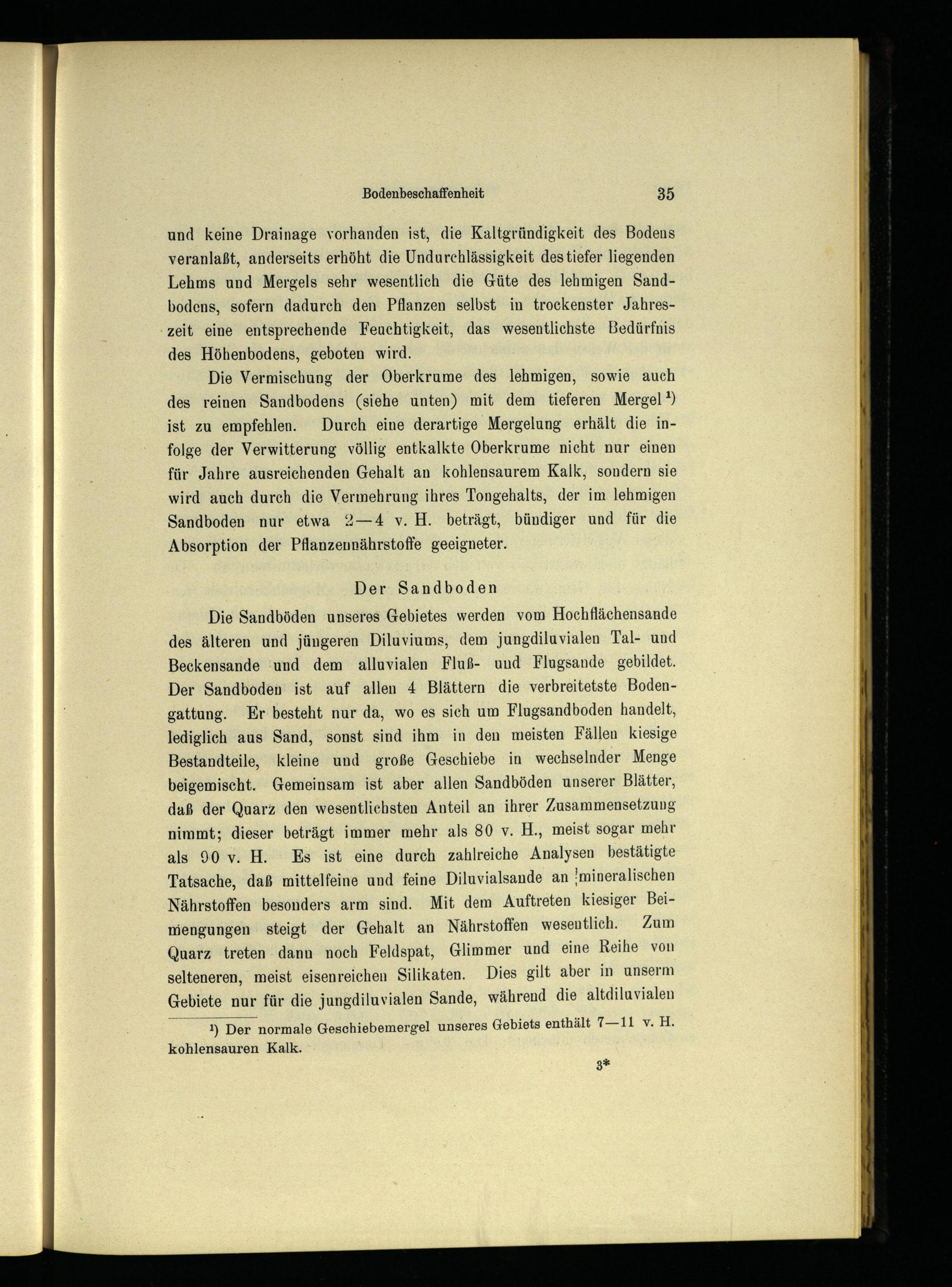 und keine Drainage vorhanden ist, die Kaltgründigkeit des Bodens veranlaßt, anderseits erhöht die Undurchlässigkeit des tiefer liegenden Lehms und Mergels sehr wesentlich die Güte des lehmigen Sandbodens, sofern dadurch den Pflanzen selbst in trockenster Jahreszeit eine entsprechende Feuchtigkeit, das wesentlichste Bedürfnis des Höhenbodens, geboten wird.