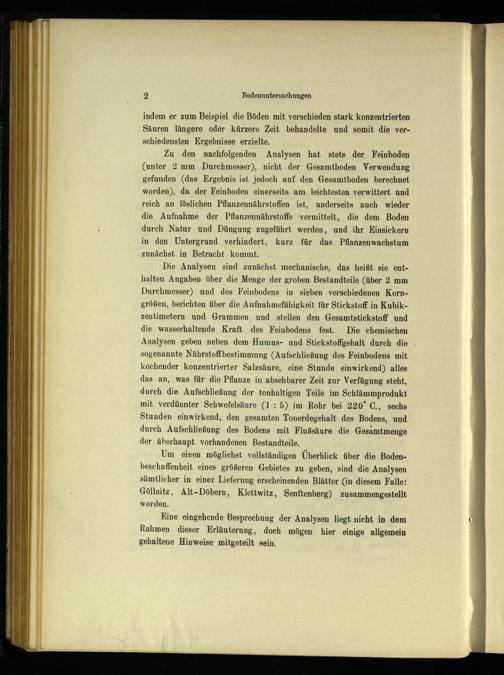 Zu den nachfolgenden Analysen hat stets der Feinboden (unter 2 mm Durchmesser), nicht der Gesamtboden Verwendung gefunden(das Ergebnis ist jedoch auf den Gesamtboden berechnet worden), da der Feinboden einerseits am leichtesten verwittert und reich an löslichen Pflanzennährstoffen ist, anderseits auch wieder die Aufnahme der Pflanzennährstoffe vermittelt, die dem Boden durch Natur und Düngung zugeführt werden, und ihr Einsickern in den Untergrund verhindert, kurz für das Pflanzenwachstum zunächst in Betracht kommt.