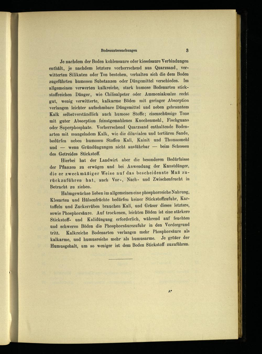 Je nachdem der Boden kohlensaure oder kieselsaure Verbindungen enthält, je nachdem letztere vorherrschend aus Quarzsand, verwitterten Silikaten oder Ton bestehen, verhalten sich die dem Boden zugeführten humosen Substanzen oder Düngemittel verschieden. Im allgemeinen verwerten kalkreiche, stark humose Bodenarten stickstoffreichen Dünger, wie Chilisalpeter oder Ammoniaksalze recht gut, wenig verwitterte, kalkarme Böden mit geringer Absorption verlangen leichter aufnehmbare Düngemittel und neben gebranntem Kalk selbstverständlich auch humose Stoffe; eisenschüssige Tone mit guter Absorption feinstgemahlenes Knochenmehl, Fischguano oder Superphosphate. Vorherrschend Quarzsand enthaltende Bodenarten mit mangelndem Kalk, wie die diluvialen und tertiären Sande, bedürfen neben humosen Stoffen Kali, Kainit und Thomasmehl und— wenn Gründüngungen nicht ausführbar— beim Schossen des Getreides Stickstoff.