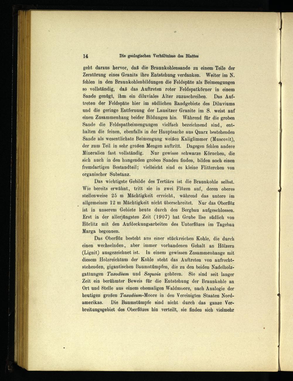 geht daraus hervor, daß die Braunkohlensande zu einem Teile der Zerstörung eines Granits ihre Entstehung verdanken. Weiter im N. fehlen in den Braunkohlenbildungen die Feldspäte als Beimengungen so vollständig, daß das Auftreten roter Feldspatkörner in einem Sande genügt, ihm ein diluviales Alter zuzuschreiben. Das Auftreten der Feldspäte hier im südlichen Randgebiete des Diluviums und die geringe Entfernung der Lausitzer Granite im S. weist auf einen Zusammenhang beider Bildungen hin. Während für die groben Sande die Feldspatbeimengungen vielfach bezeichnend sind, enthalten die feinen, ebenfalls in der Hauptsache aus Quarz bestehenden Sande als wesentlichste Beimengung weißen Kaliglimmer(Muscovit), der zum Teil in sehr großen Mengen auftritt. Dagegen fehlen andere Mineralien fast vollständig. Nur gewisse schwarze Körnchen, die sich auch in den hangenden groben Sanden finden, bilden noch einen fremdartigen Bestandteil; vielleicht sind es kleine Flitterchen von organischer Substanz.