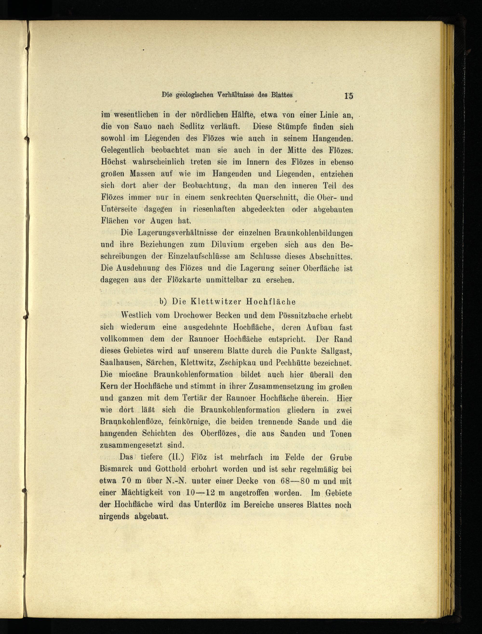 Westlich vom Drochower Becken und dem Pössnitzbache erhebt sich wiederum eine ausgedehnte Hochfläche, deren Aufbau fast vollkommen dem der Raunoer Hochfläche entspricht. Der Rand dieses Gebietes wird auf unserem Blatte durch die Punkte Sallgast , Saalhausen, Särchen , Klettwitz , Zschipkau und Pechhütte bezeichnet. Die miocäne Braunkohlenformation bildet auch hier überall den Kern der Hochfläche und stimmt: in ihrer Zusammensetzung im großen und ganzen mit dem Tertiär der Raunoer Hochfläche überein. Hier wie dort läßt sich die Braunkohlenformation gliedern in zwei Braunkohlenflöze, feinkörnige, die beiden trennende Sande und die hangenden Schichten des Oberflözes, die aus Sanden und Tonen zusammengesetzt sind.