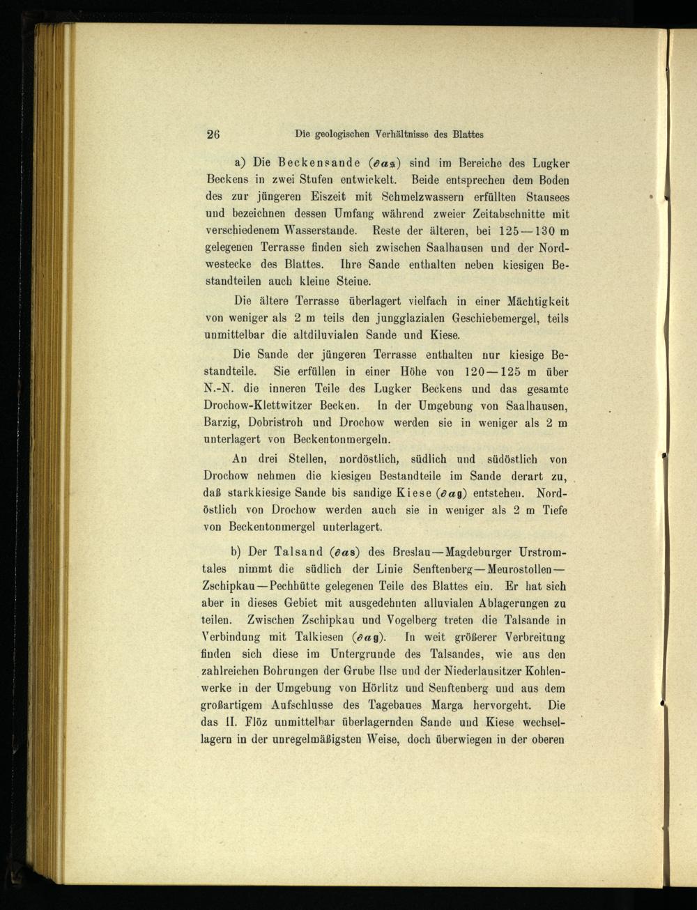 a) Die Beckensande(das) sind im Bereiche des Lugker Beckens in zwei Stufen entwickelt. Beide entsprechen dem Boden des zur jüngeren Kiszeit mit Schmelzwassern erfüllten Stausees und bezeichnen dessen Umfang während zweier Zeitabschnitte mit verschiedenem Wasserstande. Reste der älteren, bei 125— 130 m gelegenen Terrasse finden sich zwischen Saalhausen und der Nordwestecke des Blattes. Ihre Sande enthalten neben kiesigen Bestandteilen auch kleine Steine.