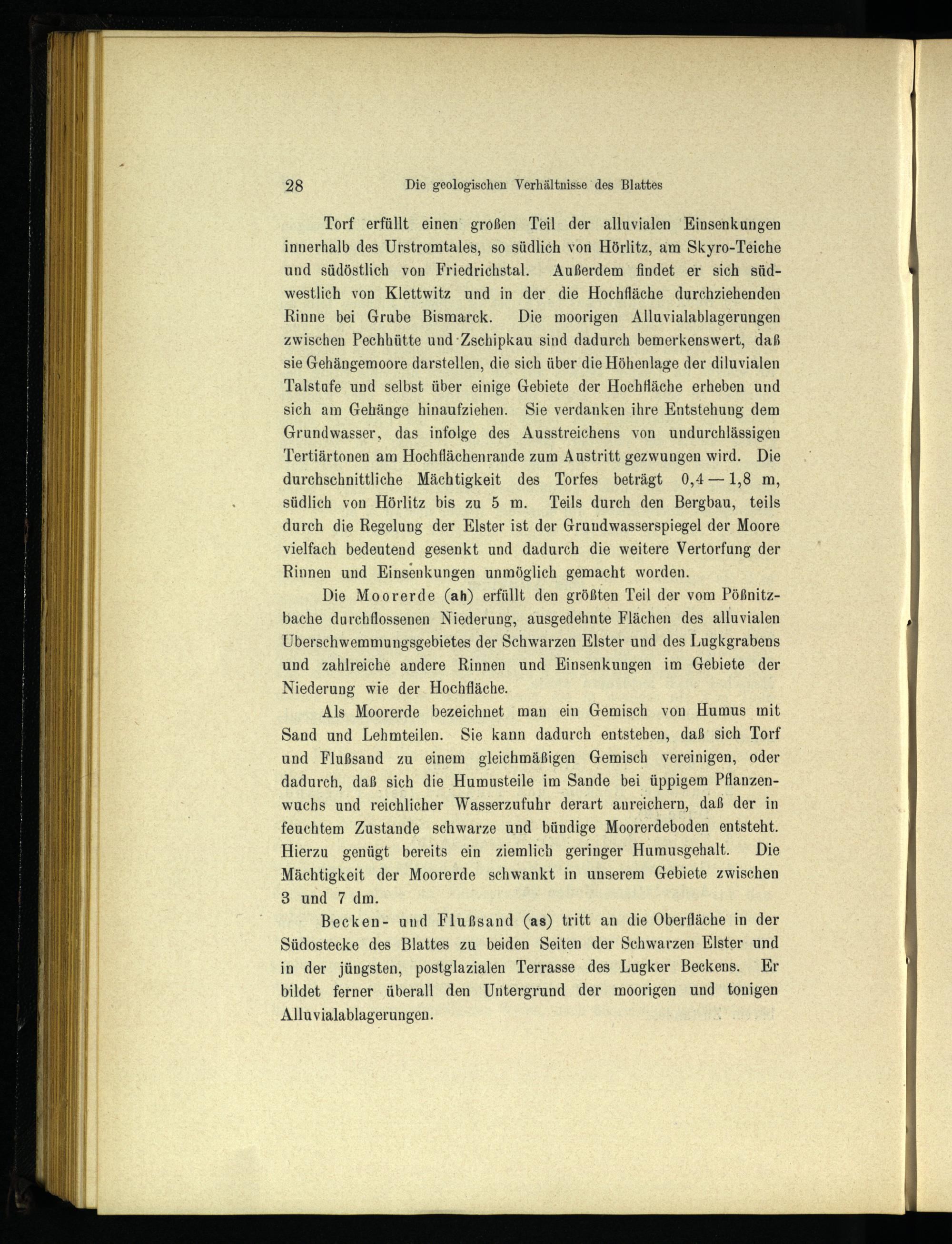 Torf erfüllt. einen‘ großen Teil der alluvialen‘Einsenkungen innerhalb des Urstromtales, so südlich von Hörlitz, am Skyro-Teiche und südöstlich von Friedrichstal . Außerdem findet er sich südwestlich von Klettwitz und in der die Hochfläche durchziehenden Rinne bei Grube Bismarck. Die moorigen Alluvialablagerungen zwischen Pechhütte und Zschipkau sind dadurch bemerkenswert, daß sie Gehängemoore darstellen, die sich über die Höhenlage der diluvialen Talstufe und selbst über einige Gebiete der Hochfläche erheben und sich am Gehänge hinaufziehen. Sie verdanken ihre Entstehung dem Grundwasser, das infolge des Ausstreichens von undurchlässigen Tertiärtonen am Hochflächenrande zum Austritt gezwungen wird. Die durchschnittliche Mächtigkeit des Torfes beträgt 0,4—1,8 m, südlich von Hörlitz bis zu 5 m. Teils durch den Bergbau, teils durch die Regelung der Elster ist der Grundwasserspiegel der Moore vielfach bedeutend gesenkt und dadurch die weitere Vertorfung der Rinnen und Einsenkungen unmöglich gemacht worden.