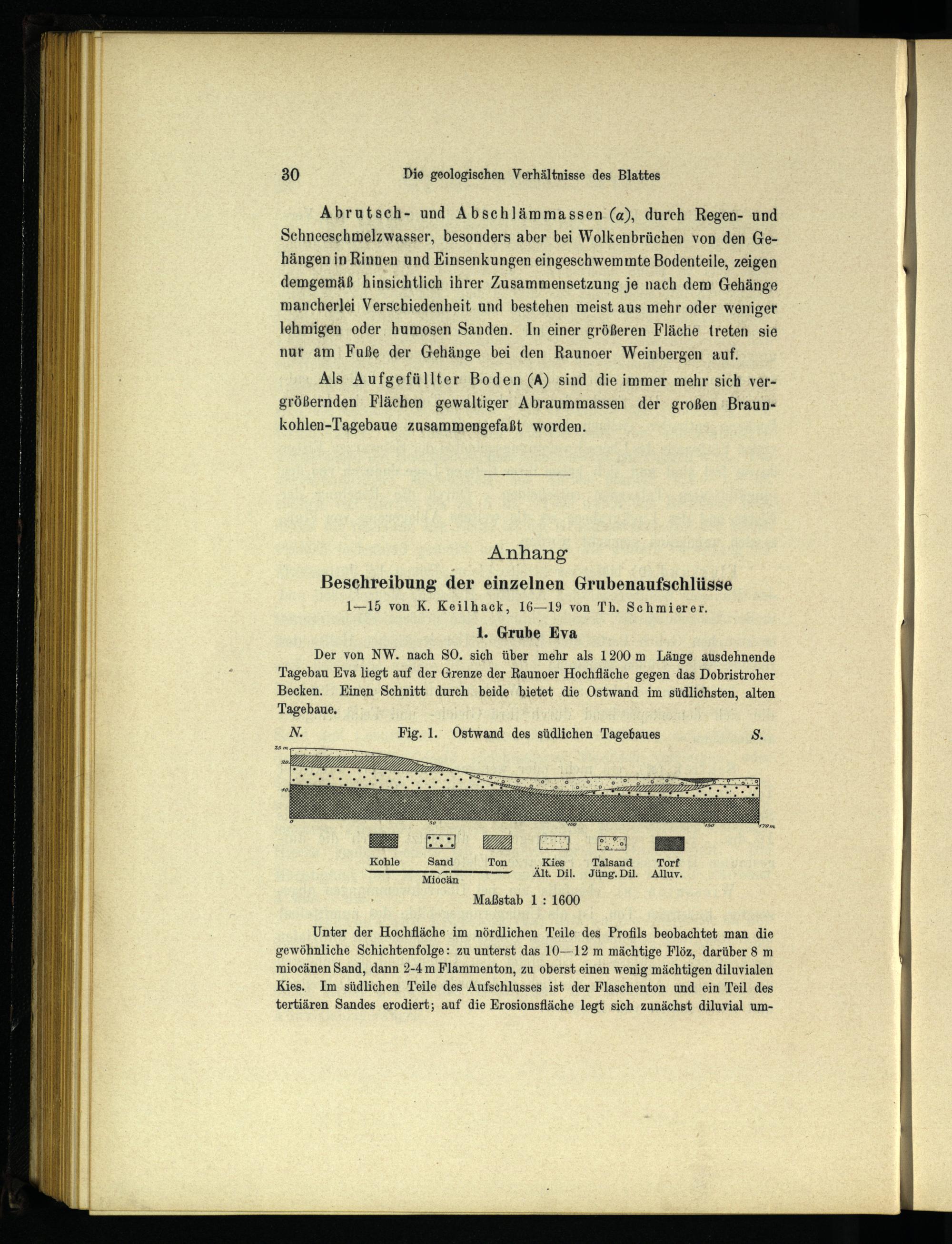 Der von NW. nach SO. sich über mehr als 1200 m Länge ausdehnende Tagebau Eva liegt auf der Grenze der Raunoer Hochfläche gegen das Dobristroher Becken. Einen Schnitt durch beide bietet die Ostwand im südlichsten, alten Tagebaue,