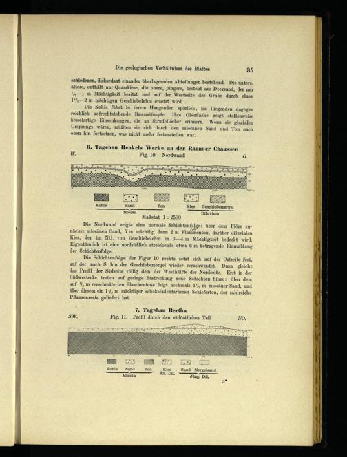 Die Nordwand zeigte eine normale Schichtenfolge: über dem Flöze zunächst miocänen Sand, 7 m mächtig, dann 2 m Flammenton, darüber diluvialen Kies, der im NO. von Geschiebelehm in 3—4 m Mächtigkeit bedeckt wird. Kigentümlich ist eine nordsüdlich streichende etwa 6m betragende Einmuldung der Schichtenfolge.