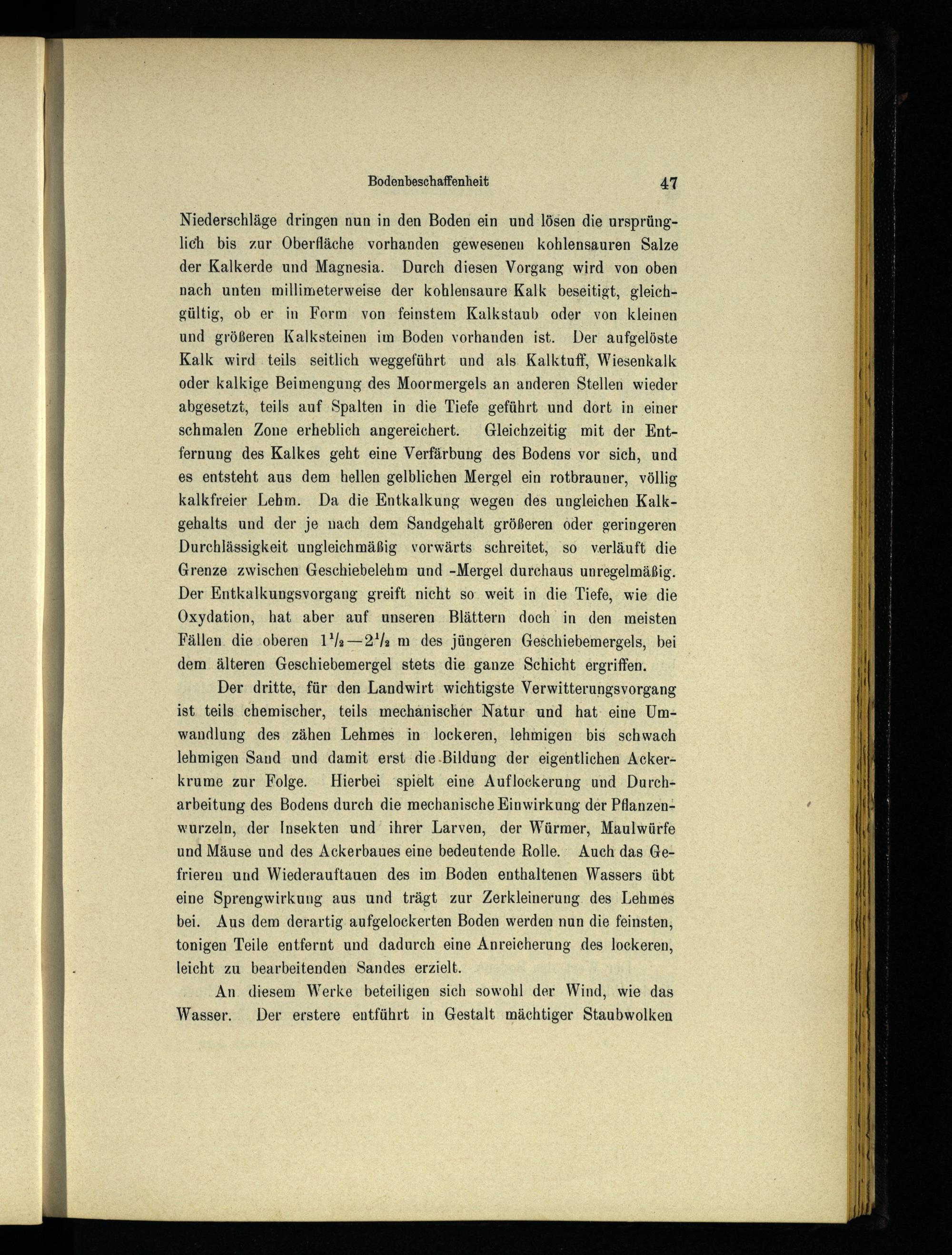 Der dritte, für den Landwirt wichtigste Verwitterungsvorgang ist. teils chemischer, teils mechanischer Natur und hat: eine Umwandlung des zähen Lehmes in lockeren, lehmigen bis schwach lehmigen Sand und damit erst die.-Bildung der eigentlichen Ackerkrume zur Folge. Hierbei‘spielt eine Auflockerung und Durcharbeitung des Bodens durch die mechanische Einwirkung der Pflanzenwurzeln, der Insekten und ihrer Larven, der Würmer, Maulwürfe und Mäuse und des Ackerbaues eine bedeutende Rolle. Auch das Gefrieren und Wiederauftauen des im Boden enthaltenen Wassers übt eine Sprengwirkung aus und trägt zur Zerkleinerung. des Lehmes bei. Aus dem derartig aufgelockerten Boden werden nun die feinsten; tonigen Teile entfernt und dadurch eine Anreicherung des lockeren, leicht zu bearbeitenden Sandes erzielt.
