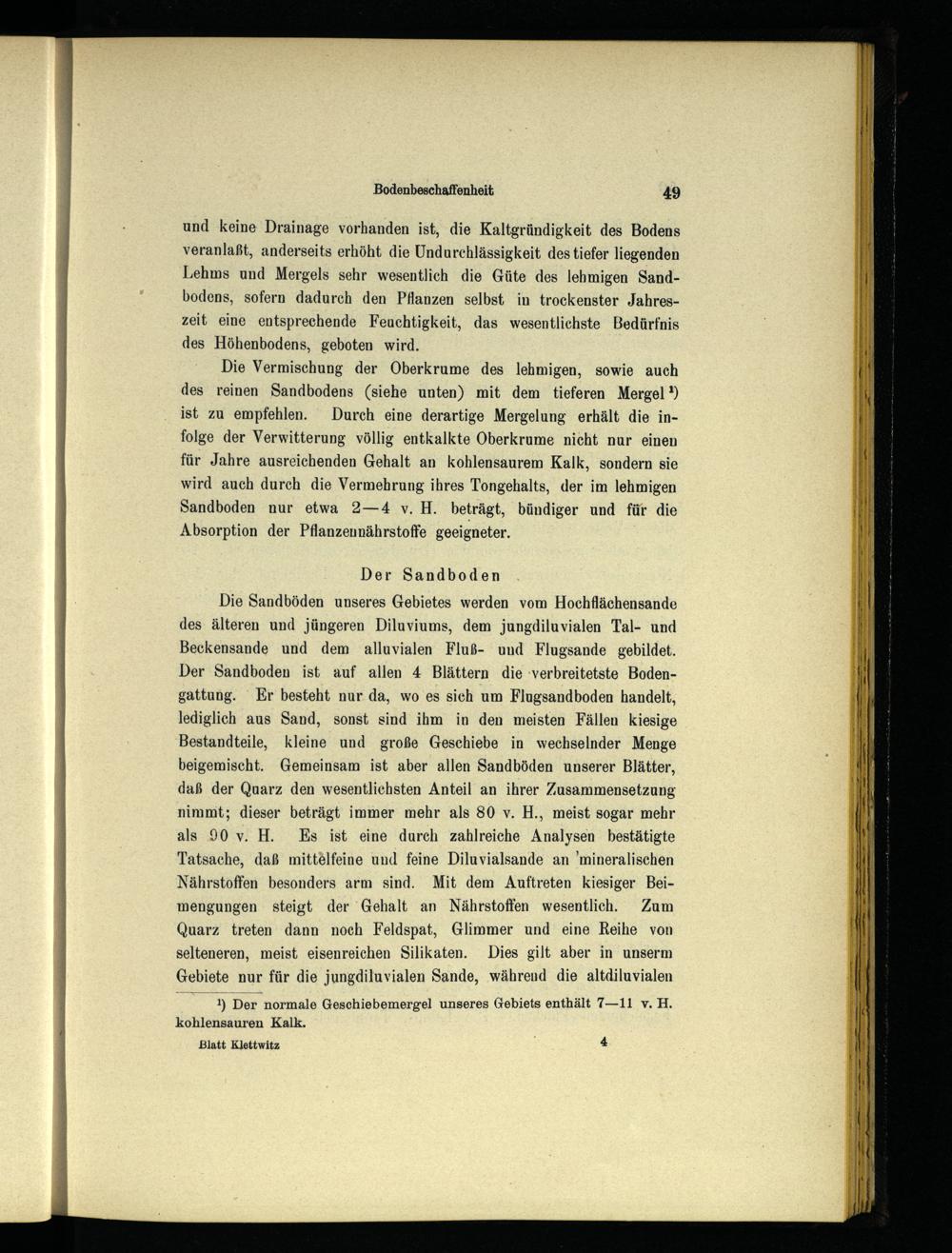 und keine Drainage vorhanden ist, die Kaltgründigkeit des Bodens veranlaßt, anderseits erhöht die Undurchlässigkeit des tiefer liegenden Lehms und Mergels sehr wesentlich die Güte des lehmigen Sandbodens, sofern dadurch den Pflanzen selbst in trockenster Jahreszeit eine entsprechende Feuchtigkeit, das wesentlichste Bedürfnis des Höhenbodens, geboten wird.