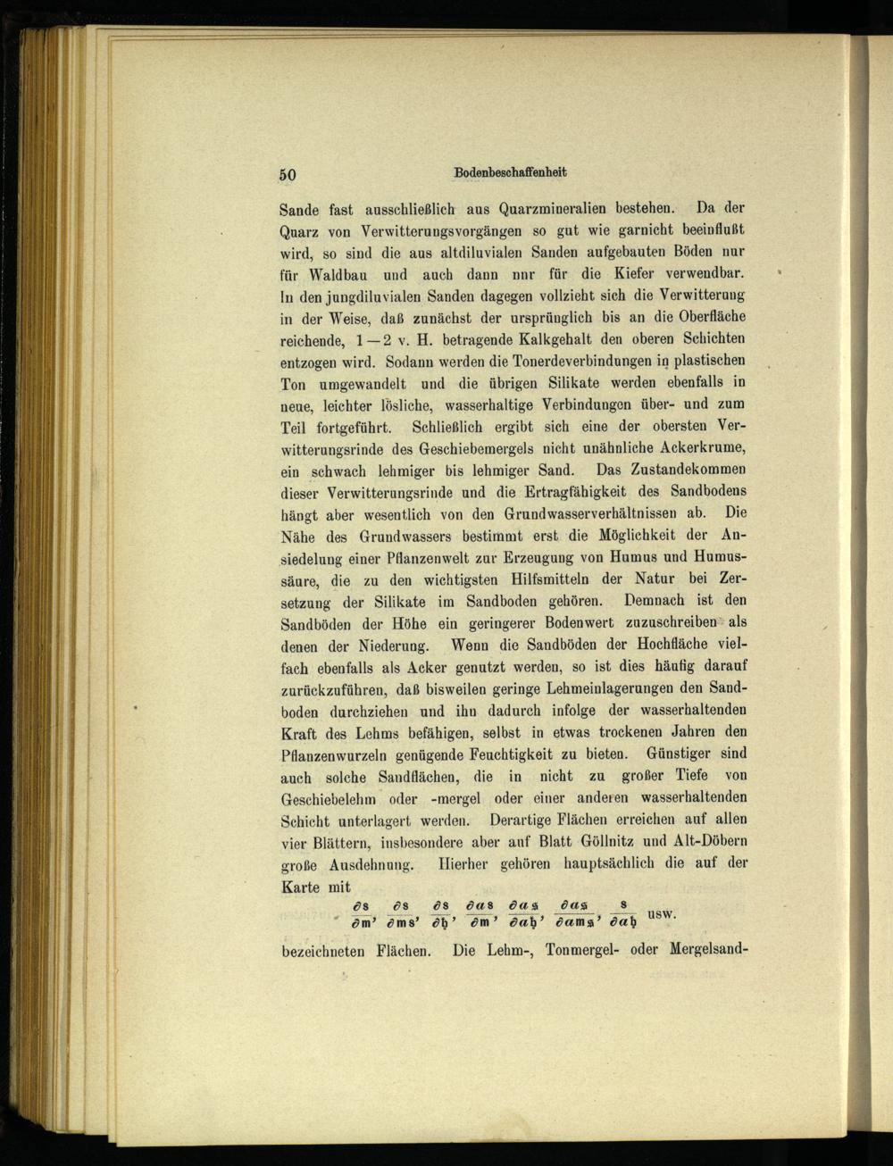 Sande fast ausschließlich aus Quarzmineralien bestehen. Da der Quarz von Verwitterungsvorgängen so gut wie garnicht beeinflußt wird, so sind die aus altdiluvialen Sanden aufgebauten Böden nur für Waldbau und auch dann nnr für die Kiefer verwendbar. In den jungdiluvialen Sanden dagegen vollzieht sich die Verwitterung in der Weise, daß zunächst der ursprünglich bis an die Oberfläche reichende, 1—2 v. H. betragende Kalkgehalt den oberen Schichten entzogen wird. Sodann werden die Tonerdeverbindungen in plastischen Ton umgewandelt und die übrigen Silikate werden ebenfalls in neue, leichter lösliche, wasserhaltige Verbindungen über- und zum Teil fortgeführt. Schließlich ergibt sich eine der obersten Verwitterungsrinde des Geschiebemergels nicht unähnliche Ackerkrume, ein ‚schwach lehmiger bis lehmiger Sand. Das Zustandekommen dieser Verwitterungsrinde und die Ertragfähigkeit des Sandbodens hängt aber wesentlich von den Grundwasserverhältnissen ab. Die Nähe des Grundwassers bestimmt erst die Möglichkeit der Ansiedelung einer Pflanzenwelt zur Erzeugung von Humus und Humussäure, die zu den wichtigsten Hilfsmitteln der Natur bei Zersetzung der Silikate im Sandboden gehören. Demnach ist den Sandböden der Höhe ein geringerer Bodenwert zuzuschreiben“ als denen der Niederung. Wenn die Sandböden der Hochfläche vielfach ebenfalls als Acker genutzt werden, so ist dies häufig darauf zurückzuführen, daß bisweilen geringe Lehmeinlagerungen den Sandboden durchziehen und ihn dadurch infolge der wasserhaltenden Kraft des Lehms befähigen, selbst in etwas trockenen Jahren den Pflanzenwurzeln genügende Feuchtigkeit zu bieten. Günstiger sind auch solche Sandflächen, die in nicht zu großer Tiefe von Geschiebelehm oder-mergel oder einer anderen wasserhaltenden Schicht unterlagert werden. Derartige Flächen erreichen auf allen vier Blättern, insbesondere aber auf Blatt Göllnitz und Alt-Döbern große Ausdehnung. Hierher gehören hauptsächlich die auf der