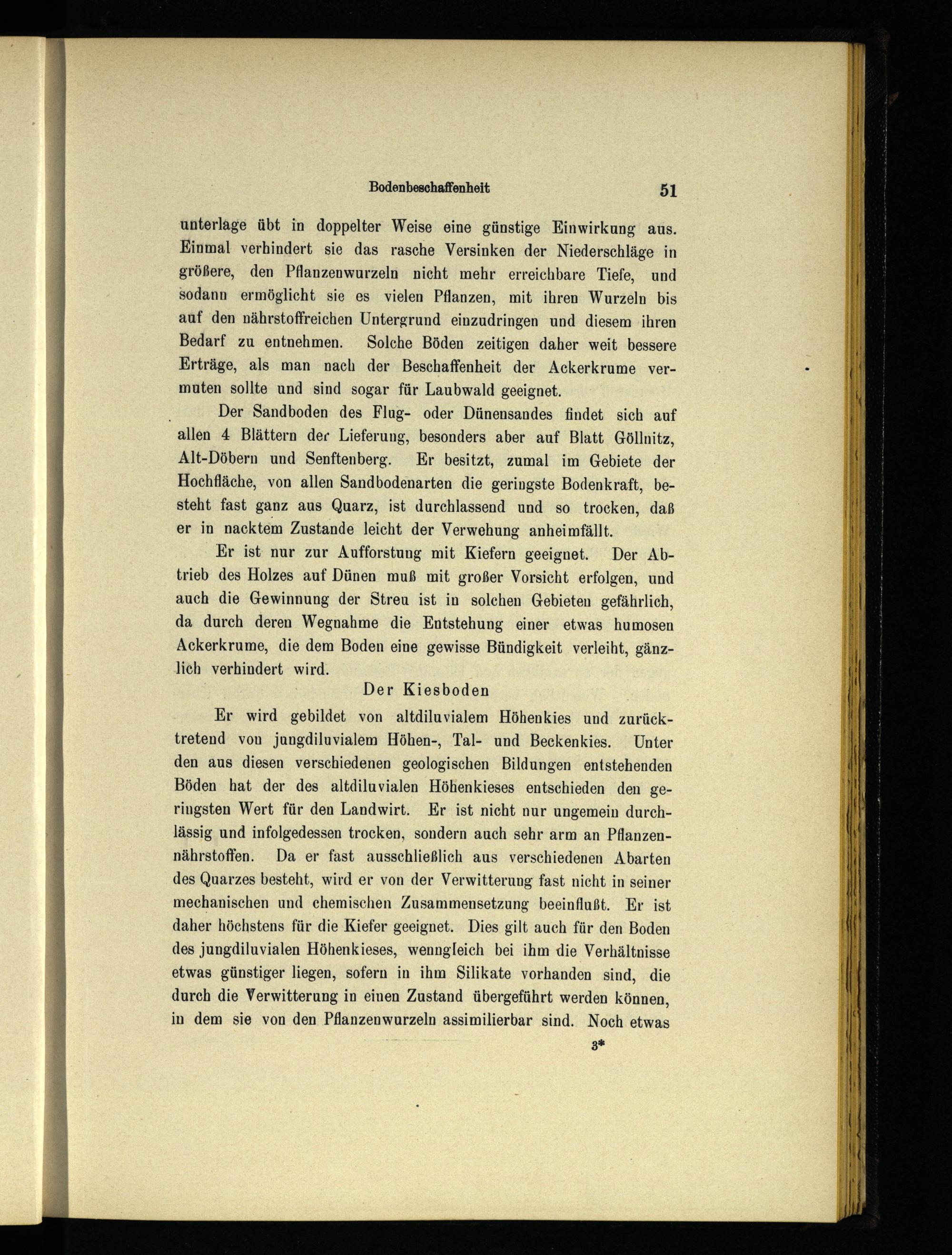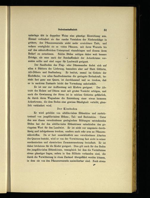 Er wird gebildet von altdiluvialem Höhenkies und zurücktretend von jungdiluvialem Höhen-, Tal- und Beckenkies. Unter den aus diesen verschiedenen geologischen Bildungen entstehenden Böden hat der des altdiluvialen Höhenkieses entschieden den geringsten Wert für den Landwirt. Er ist nicht nur ungemein durchlässig und infolgedessen trocken, sondern auch sehr arm an Pflanzennährstoffen. Da er fast ausschließlich aus verschiedenen Abarten des Quarzes besteht, wird er von der Verwitterung fast nicht in seiner mechanischen und chemischen Zusammensetzung beeinflußt. Er ist daher höchstens für die Kiefer geeignet. Dies gilt auch für den Boden des jungdiluvialen Höhenkieses, wenngleich bei ihm die Verhältnisse etwas günstiger liegen, sofern in ihm Silikate vorhanden sind, die durch die Verwitterung in einen Zustand übergeführt werden können, in dem sie von den Pflanzenwurzeln assimilierbar sind. Noch etwas 3*