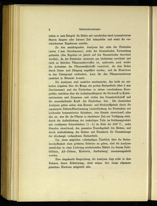 Die Analysen sind zunächst mechanische, das heißt sie enthalten Angaben über die Menge der groben Bestandteile(über 2 mm Durchmesser) und des Feinbodens: in sieben verschiedenen Korngrößen, berichten über die Aufnahmefähigkeit für Stickstoff in Kubikzentimetern und Grammen und stellen den Gesamtstickstoff und die wasserhaltende Kraft des Feinbodens fest. Die chemischen Analysen geben neben dem Humus- und Stickstoffgehalt durch die sogenannte Nährstoffbestimmung(Aufschließung des Feinbodens mit kochender konzentrierter Salzsäure, eine Stunde einwirkend) alles das an, was für die Pflanze in absehbarer Zeit zur Verfügung steht, durch die Aufschließung der tonhaltigen Teile im Schlämmprodukt mit verdünnter Schwefelsäure(1: 5) im Rohr bei 220° C., sechs Stunden einwirkend, den gesamten Tonerdegehalt des Bodens, und durch Aufschließung des Bodens mit Flußsäure die Gesamtmenge der überhaupt vorhandenen Bestandteile.
