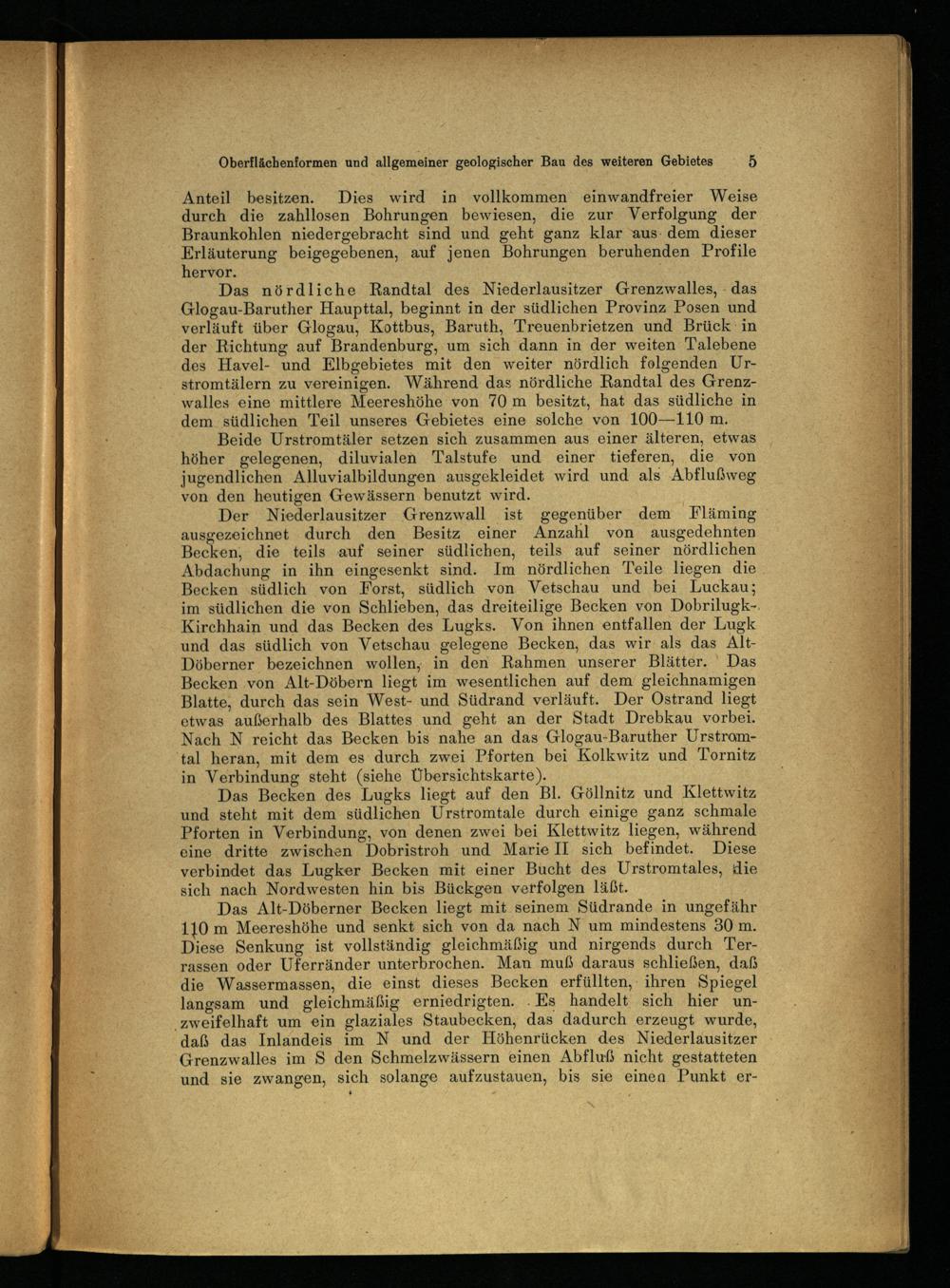 Der Niederlausitzer Grenzwall ist gegenüber‘ dem Fläming ausgezeichnet durch den Besitz einer Anzahl von ausgedehnten Becken, die teils auf seiner südlichen, teils auf seiner nördlichen Abdachung in ihn eingesenkt sind. Im nördlichen Teile liegen die Becken ‚südlich von Forst, südlich von Vetschau und bei Luckau ; im südlichen die von Schlieben , das dreiteilige Becken von Dobrilugk -. Kirchhain und das Becken des Lugks. Von ihnen entfallen der Lugk und das südlich von Vetschau gelegene Becken, das wir als das AltDöberner bezeichnen wollen; in den Rahmen unserer Blätter.' Das Becken von Alt-Döbern liegt im wesentlichen auf dem gleichnamigen Blatte, durch das sein West- und Südrand verläuft. Der Ostrand liegt etwas außerhalb des Blattes und geht an der Stadt Drebkau vorbei. Nach N reicht das Becken bis nahe an das Glogau-Baruther Urstromtal heran, mit dem es durch zwei Pforten bei Kolkwitz und Tornitz in Verbindung steht(siehe Übersichtskarte).