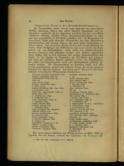 Die Braunkohlen selbst, obwohl ganz und gar aus pflanzlichen Stoffen aufgebaut, führen nur selten deutlich erkennbare und bestimmbare organische Reste, abgesehen natürlich von den vortrefflich erhaltenen Hölzern. Zapfen, Nüsse, Magnoliensamenstände ist alles, was man gelegentlich in der Kohle gefunden hat. Im Hangenden des Unterflözes findet sich bisweilen Blätterkohle mit sehr undeutlichen Blattabdrücken und kleinen Samen, die noch keine Bearbeitung erfahren haben. Von ‚tierischen Resten finden sich in den Hölzern der beiden Flöze Freßgänge von Käferlarven und zwar sowohl von Bockkäfern wie von Borkenkäfern. Auch solche von holzbewohnenden Raupen(Cossus?) sind gefunden worden. Alle anderen organischen Reste finden sich in den sandigen und tonigen Begleitschichten der Kohle. In den Sanden im Hangenden des OÖberflözes sind gelegentlich sehr gut erhaltene Zapfen mehrerer Arten von Nadelhölzern, die weder zur Sumpfzypresse noch zum Mammutbaum gehören, gefunden worden. Der Hauptreichtum an Fossilien findet sich aber in fein geschichteten, grauen und violetten Tonen, die zu den jüngsten Gliedern des Miocäns gehören. Aus ihnen hat P. Menzel1) die nachstehend verzeichneten Pflanzenreste beschrieben:
