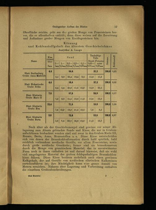 Tonhalti= Kies Sand afolle 3 S Name be Staub|Feinstes|£ 8| 2 1 0,5 0,2 0,1—|0,05—| unter| A s 2mm| Imm 0,5mm 0,2mm 0, Ynm 0,05mm|0,01mm| 0,01mm MM. 44 64,4 31,2 100,0| 0,65 d Blatt Senftenberg n LA Grabe Anna Maihilde 6,4| 8,8| 22,4| 18,4| 8,4| 15,6| 15,6 4,4 58,4 37,2 100,0| 0,82 Blatt Hohenbocke A SE Grube Erika 6,4| 6,4| 20,8| 11,6| 13,2| 14,8 224 7,6 67,6 24,8 100,0| 0,87 A Blatt Klettwitz A BEN VE RO e € Grube Marie II 7,2| 8,8| 21,6| 18| 112| 1124| 124 E 6,0 100,0| 1,08 N Platt Klettwitz.| 124 ns EI 164 HE. | Grube Eva 7,6| 13,2| 19,2 10,0| 76| 8,4 8 ‚0| 6,87 a Blatt Klettwitz 38. 728 20 j100’ Grube Berta 5,6| 8,4| 32,0 10,0| 118| 128|