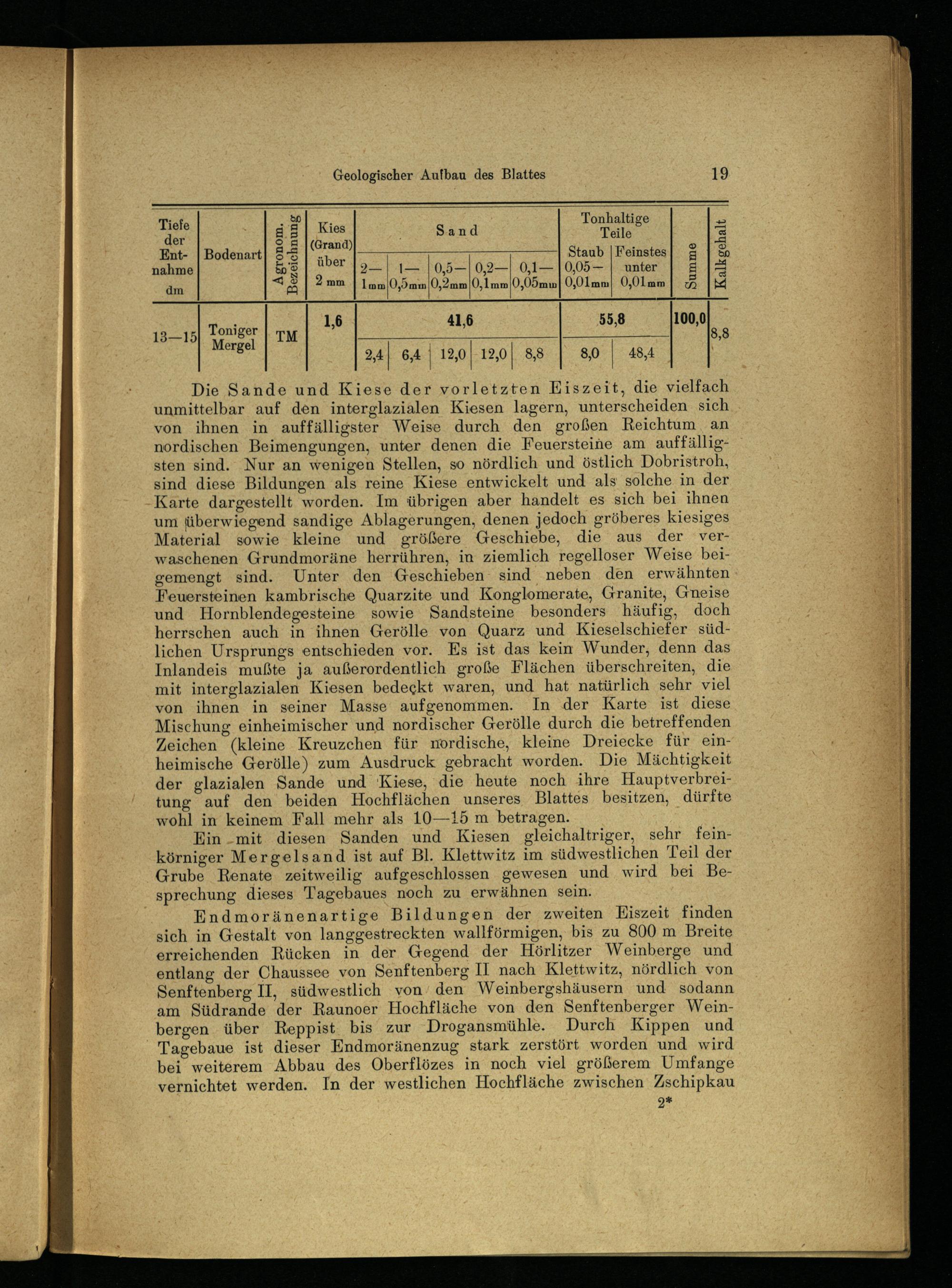 Endmoränenartige Bildungen der zweiten Eiszeit finden sich in Gestalt von langgestreckten wallförmigen, bis zu 800 m Breite erreichenden Rücken in der Gegend der Hörlitzer Weinberge und entlang der Chaussee von Senftenberg II nach Klettwitz , nördlich von Senftenberg II , südwestlich von‘ den Weinbergshäusern und sodann am Südrande der Raunoer Hochfläche von den Senftenberger Weinbergen über Reppist. bis zur Drogansmühle. Durch Kippen und Tagebaue ist dieser Endmoränenzug stark zerstört worden und wird bei weiterem Abbau des Oberflözes in noch viel größerem Umfange vernichtet werden. In der westlichen Hochfläche zwischen Zschipkau