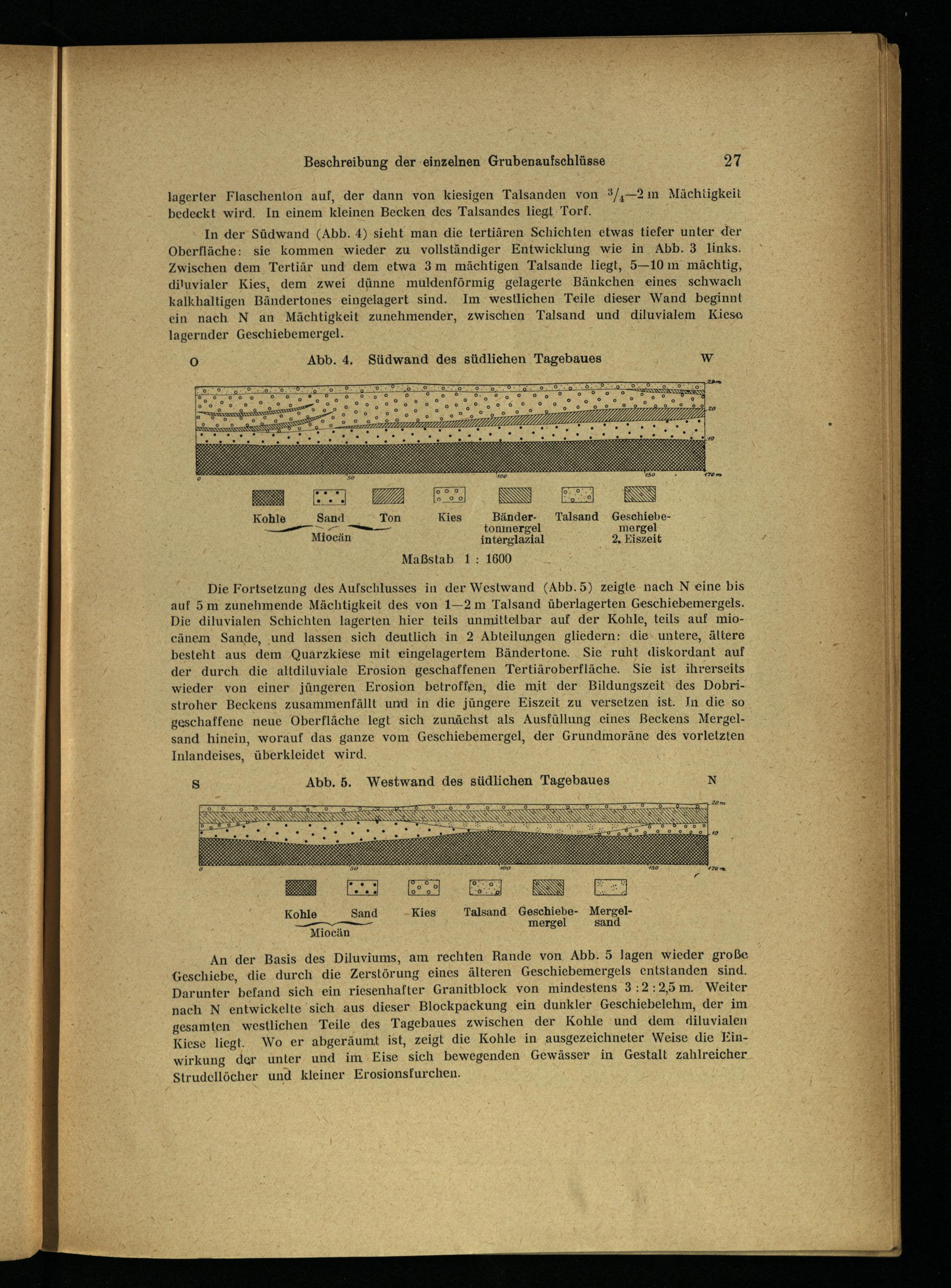 An der Basis des Diluviums, am rechten Rande von Abb. 5 lagen wieder große Geschiebe, die durch die Zerstörung eines älteren Geschiebemergels entstanden sind. Darunter befand sich ein riesenhafter Granitblock von mindestens 3:2:25m.: Weiter nach N entwickelte sich ‚aus dieser Blockpackung ein dunkler Geschiebelehm, der im gesamten westlichen Teile des Tagebaues zwischen der Kohle und dem Adiluvialen Kiese liegt. Wo er abgeräumt ist, zeigt die Kohle in ausgezeichneter Weise die Einwirkung der unter und im Eise sich bewegenden Gewässer in Gestalt zahlreicher