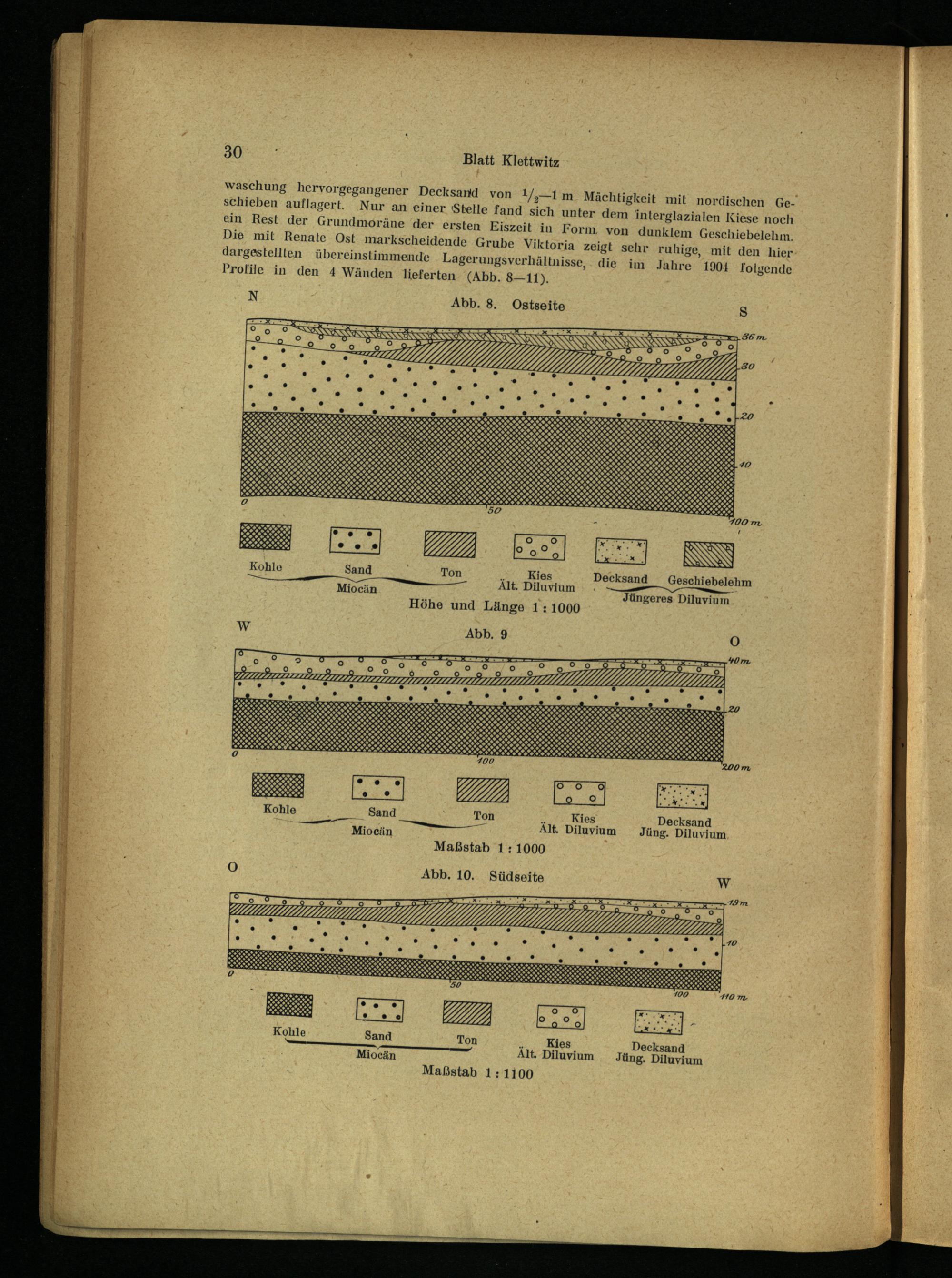 waschung hervorgegangener Decksand von 1/,—1 m Mächtigkeit mit nordischen Geschieben auflagert. Nur an einer Stelle fand sich unter dem interglazialen Kiese noch ein Rest der Grundmoräne der ersten Eiszeit in Form von dunklem Geschiebelehm. Die mit Renate Ost markscheidende Grube Viktoria zeigt sehr ruhige, mit den hierdargestelllen übereinstimmende Lagerungsverhältnisse, die im Jahre 1904 Tolgende Profile in den 4 Wänden lieferten.(Abb. 8—11).