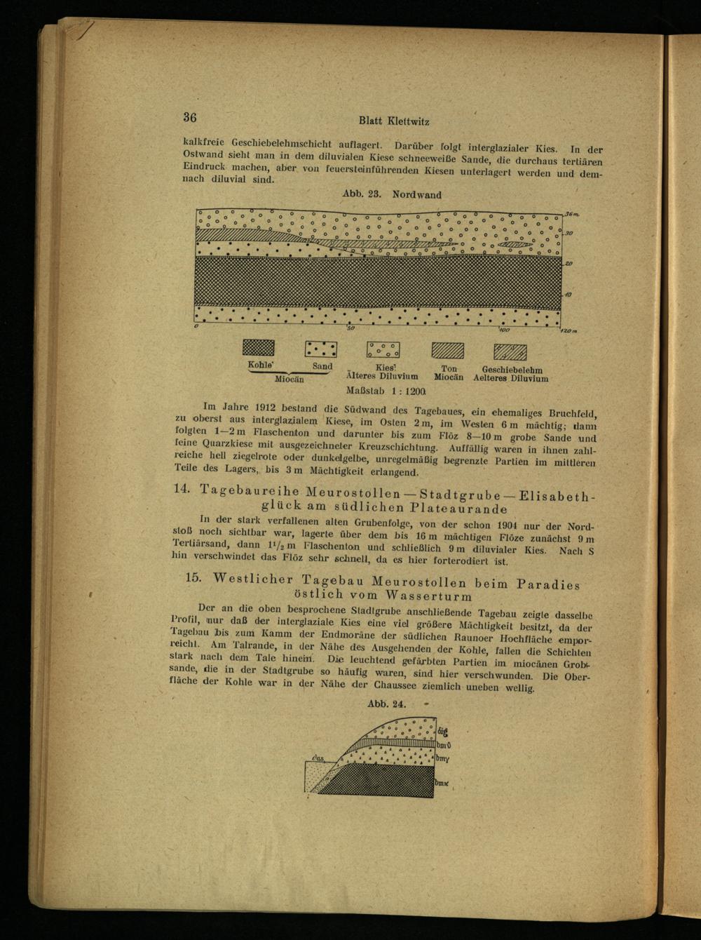 In der stark verfallenen alten Grubenfolge, von der schon 1904 nur der NordStoß noch sichtbar war, lagerte über dem bis 16m mächtigen Flöze zunächst 9m Tertiärsand, dann 11!/; m Tlaschenton und schließlich 9m diluvialer Kies. Nach S hin verschwindet das Flöz sehr schnell, da es hier forterodiert ist.