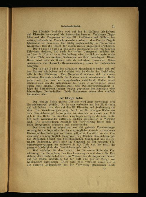 Der lehmige Boden unseres Gebietes wird ganz vorwiegend vom Geschiebemergel gebildet. Er.ist weit verbreitet auf den Bl. Göllnitz und Alt-Döbern, tritt aber auf den Bl. Klettwitz und Senftenberg zurück. Der Verwitterungsvorgang, durch den die lehmigen Böden aus dem Geschiebemergel hervorgehen, ist ziemlich verwickelt und läßt sich in eine Reihe von einzelnen Vorgängen zerlegen, die aber natürlich nicht nacheinander auftreten, sondern gleichzeitig in Wirkung sind. Die verschiedenen Zustände der Verwitterung lassen sich in jeder Mergelgrube erkennen und unterscheiden.