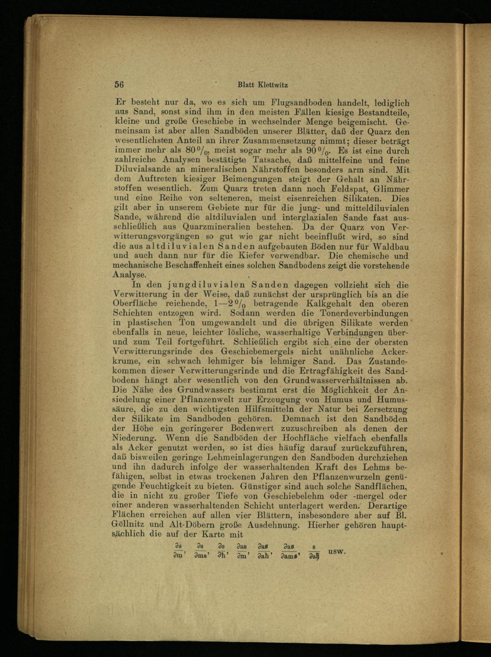Kr besteht nur da, wo es sich um Flugsandboden händelt, lediglich aus Sand, sonst sind ihm in den meisten Fällen kiesige Bestandteile, kleine‘ und große Geschiebe in wechselnder Menge beigemischt. Gemeinsam ist aber allen Sandböden unserer Blätter, daß der Quarz den wesentlichsten Anteil an ihrer, Zusammensetzung nimmt; dieser beträgt immer mehr als 80°%/,, meist sogar mehr als 90%. Es ist eine durch zahlreiche Analysen bestätigte Tatsache, daß mittelfeine und feine Diluvialsande an mineralischen Nährstoffen besonders arm sind. Mit dem Auftreten kiesiger Beimengungen steigt der Gehalt an Nährstoffen wesentlich. Zum Quarz treten dann noch Feldspat, Glimmer und eine Reihe von selteneren, meist eisenreichen Silikaten. Dies gilt aber in unserem Gebiete nur für die jung- und mitteldiluvialen Sande, während die altdiluvialen und interglazialen Sande fast ausschließlich aus Quarzmineralien bestehen. Da der Quarz von Verwitterungsvorgängen so gut wie gar nicht beeinflußt wird, so sind die aus altdiluvialen Sanden aufgebauten Böden nur für Waldbau und auch dann nur für die Kiefer verwendbar. Die chemische und mechanische Beschaffenheit eines solchen Sandbodens zeigt die vorstehende Analyse.: