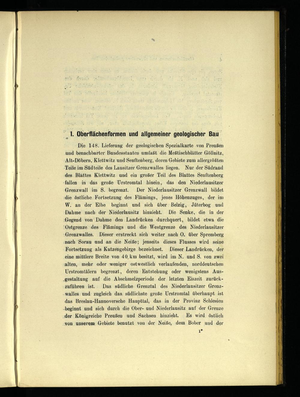 Die 148. Lieferung der geologischen Spezialkarte von Preußen und benachbarter Bundesstaaten umfaßt. die Meßtischblätter Göllnitz , Alt-Döbern , Klettwitz und Senftenberg , deren Gebiete zum allergrößten Teile im Südteile des Lausitzer Grenzwalles liegen. Nur der Südrand des. Blättes Klettwitz und ein großer Teil des Blattes Senftenberg fallen in das große Urstromtal ‚hinein, das den Niederlausitzer Grenzwall im S. begrenzt. Der Niederlausitzer Grenzwall bildet ‚die östliche. Fortsetzung des Flämings, jenes Höhenzuges, der im W. an der Elbe beginnt und sich über; Belzig , Jüterbog ‚und Dahme ‘ nach der Niederlausitz hinzieht. Die Senke, die in der Gegend von Dahme den. Landrücken durchquert, bildet etwa die ‘Ostgrenze. des Flämings und die Westgrenze des Niederlausitzer Grenzwalles. Dieser erstreckt sich weiter nach O. über Spremberg nach Sorau und an die Neiße ; jenseits dieses Flusses wird: seine Fortsetzung als Katzengebirge bezeichnet. Dieser Landrücken, der eine mittlere Breite von 40km besitzt, wird im N. und S. von zwei alten, mehr oder ‚weniger:ostwestlich verlaufenden, norddeutschen Urstromtälern begrenzt, deren Entstehung oder wenigstens Aus‚gestaltung auf die Abschmelzperiode der letzten Eiszeit zurückzuführen ist. Das südliche Grenztal des Niederlausitzer Grenzwalles: und zugleich das südlichste große Urstromtal überhaupt ist das Breslau -Hannoversche Haupttal, das in der Provinz Schlesien -beginnt und sich durch die Ober- und Niederlausitz auf der Grenze der Königreiche Preußen und Sachsen . hinzieht. Es wird östlich xon unserem: Gebiete benutzt von der Neiße , dem Bober und der