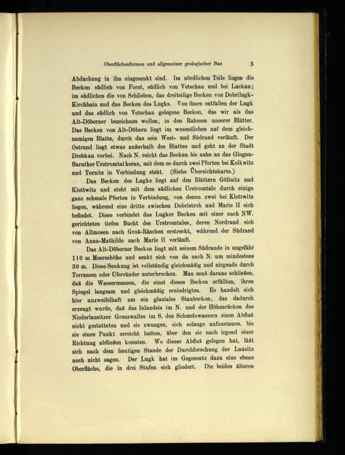 Das Becken des Lugks liegt auf den Blättern Göllnitz und Klettwitz und steht mit dem südlichen Urstromtale durch einige ganz schmale Pforten in Verbindung, von denen zwei bei Klettwitz liegen, während eine dritte zwischen Dobristroh und Marie II sich befindet. Diese verbindet das Lugker Becken mit einer nach NW. gerichteten tiefen Bucht des Urstromtales , deren Nordrand. sich von Allmosen nach Groß-Räschen erstreckt, während der Südrand von Anna-Mathilde nach Marie II verläuft.