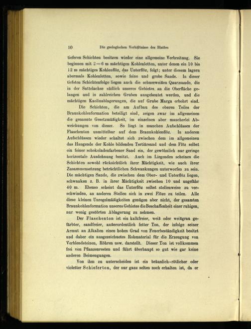 tieferen Schichten besitzen wieder eine allgemeine Verbreitung. Sie beginnen mit 2—6 m mächtigen Kohlenletten, unter denen ein 10 bis 12 m mächtiges Kohlenflöz, das Unterflöz, folgt; unter diesem lagern abermals Kohlenletten, sowie feine und‘ grobe Sande. In dieser tiefsten Schichtenfolge liegen auch die schneeweißen Quarzsande, die in der Sattelachse südlich unseres Gebietes an die Oberfläche gelangen und in zahlreichen Gruben ausgebeutet werden, und die mächtigen Kaolinablagerungen, die auf Grube Marga erbohrt sind.