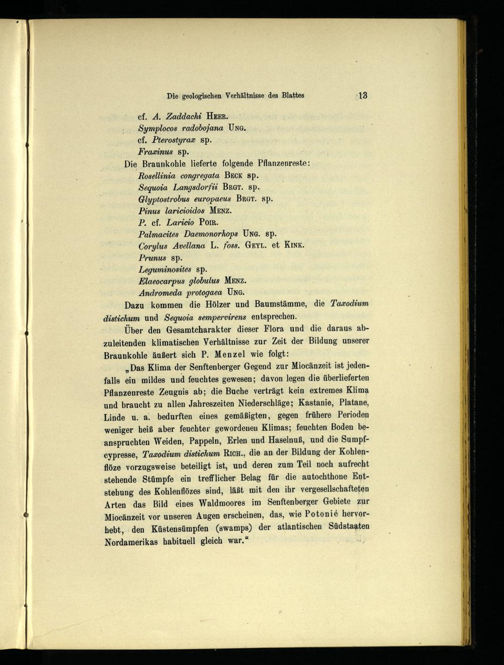 „Das Klima der Senftenberger Gegend zur Miocänzeit ist jedenfalls ein mildes und feuchtes gewesen; davon legen die überlieferten Pflanzenreste Zeugnis ab; die Buche verträgt kein extremes Klima und braucht zu allen Jahreszeiten Niederschläge; Kastanie, Platane, Linde u. a. bedurften eines gemäßigten, gegen frühere Perioden weniger heiß aber feuchter gewordenen Klimas; feuchten Boden beanspruchten Weiden, Pappeln, Erlen und Haselnuß, und die Sumpfeypresse, Taxodium distichum Rıcz., die an. der Bildung der Kohlenflöze vorzugsweise beteiligt ist, und deren zum Teil noch aufrecht stehende Stümpfe ein trefflicher Belag für die autochthone Entstehung des Kohlenflözes sind, läßt mit den ihr vergesellschafteten Arten das Bild eines Waldmoores im Senftenberger Gebiete zur Miocänzeit vor unseren Augen erscheinen, das, wie Potonie hervorhebt, den Küstensümpfen(swamps) der atlantischen Südstaaten Nordamerikas habituell gleich war,“