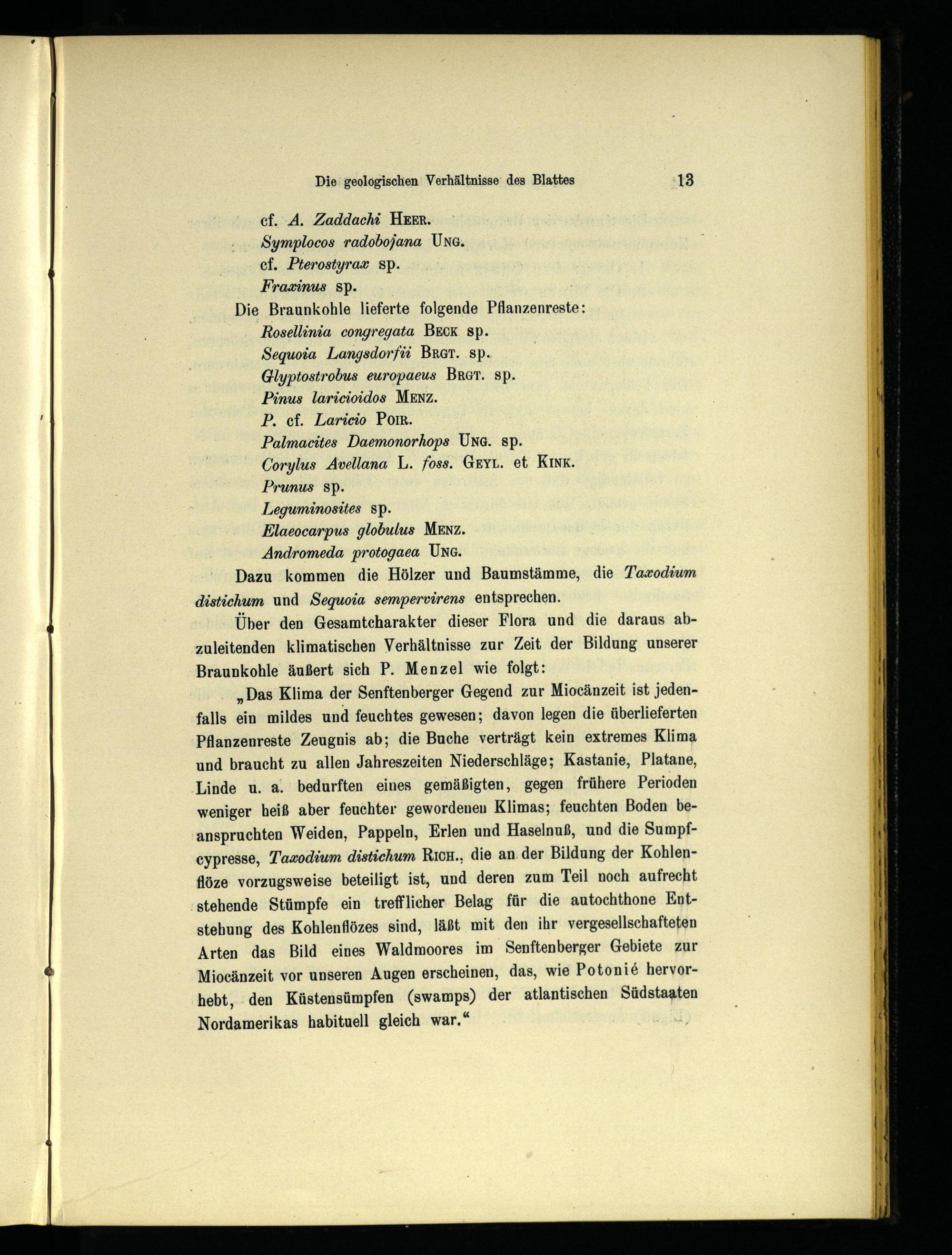 Über den Gesamtcharakter dieser Flora und die daraus abzuleitenden klimatischen Verhältnisse zur Zeit der Bildung unserer Braunkohle äußert sich P. Menzel wie folgt: