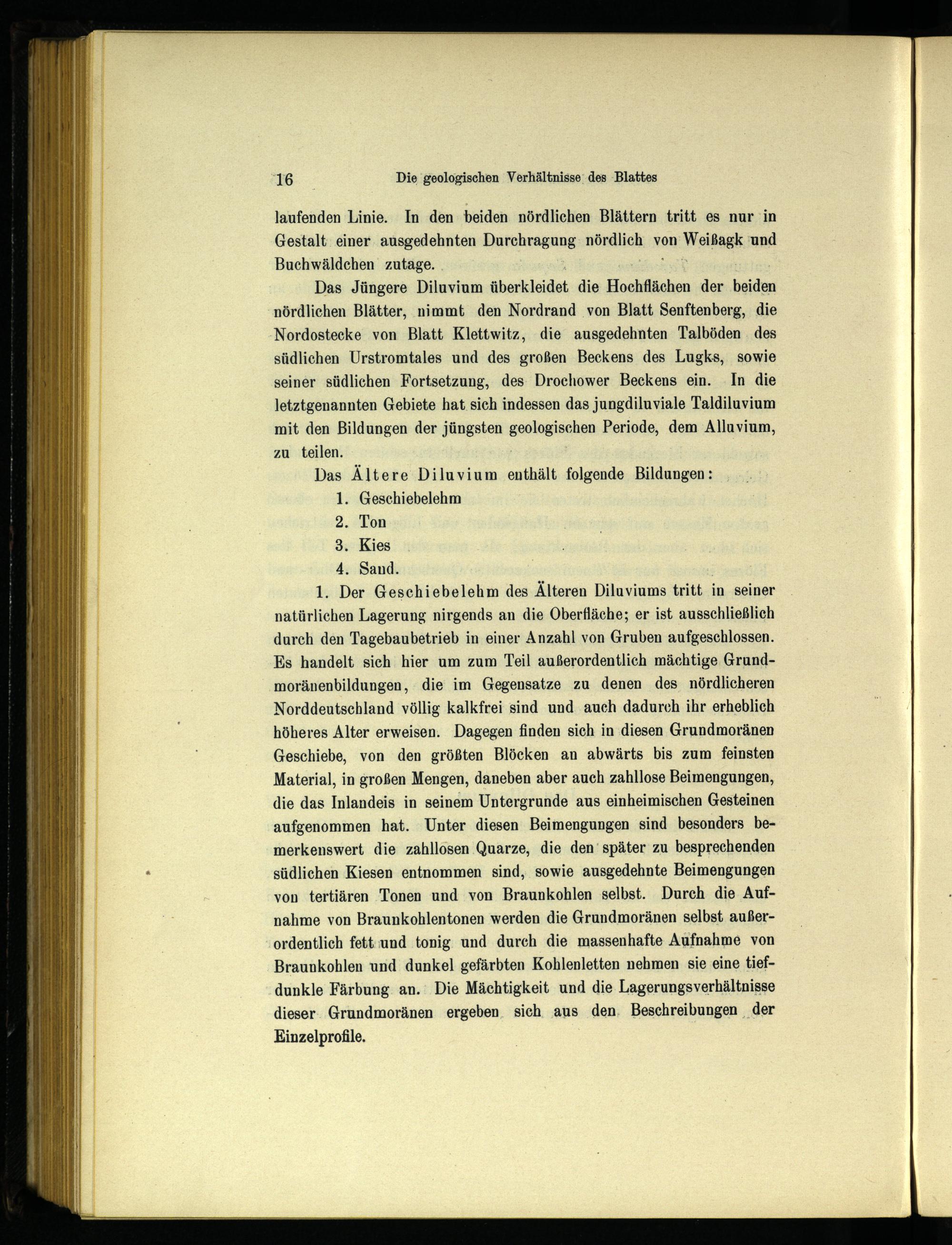 1. Der Geschiebelehm des Älteren Diluviums tritt in seiner natürlichen Lagerung nirgends an die Oberfläche; er ist ausschließlich durch den Tagebaubetrieb in einer Anzahl von Gruben aufgeschlossen. Es handelt sich hier um zum Teil außerordentlich mächtige Grundmoränenbildungen, die im Gegensatze zu denen des nördlicheren Norddeutschland völlig kalkfrei sind und auch dadurch ihr erheblich höheres Alter erweisen. Dagegen finden sich in diesen Grundmoränen Geschiebe, von den größten Blöcken an abwärts bis zum feinsten Material, in großen Mengen, daneben aber auch zahllose Beimengungen, die das Inlandeis in seinem Untergrunde aus einheimischen Gesteinen aufgenommen hat. Unter diesen Beimengungen sind besonders bemerkenswert die zahllösen Quarze, die den’ später zu besprechenden südlichen Kiesen entnommen sind, sowie ausgedehnte Beimengungen von tertiären Tonen und von Braunkohlen selbst. Durch die Aufnahme von Braunkohlentonen werden die Grundmoränen selbst außerordentlich fettund tonig. und durch die massenhafte Aufnahme von Braunkohlen und dunkel gefärbten Kohlenletten nehmen sie eine tiefdunkle Färbung an. Die Mächtigkeit und die Lagerungsverhältnisse dieser. Grundmoränen ergeben, sich, aus den. Beschreibungen der Einzelprofile.