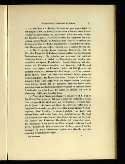 72. Der Ton des Älteren Diluviums ist ganz ausschließlich in der Tongrube der Ilse beobachtet und zwar in Gestalt zweier linsenförmiger Einlagerungen in den Quarzkiesen. Nicht diese Tone, sondern die darunter folgenden Flaschentone bilden den Gegenstand der Ausbeutung in dieser Grube. Im Gegensatz zum tertiären Flaschenton sind die diluvialen Tone von dunkel-graublauer Farbe; sie enthalten undeutliche Pflanzenreste und stellen vielleicht eine Interglazialbildung dar.
