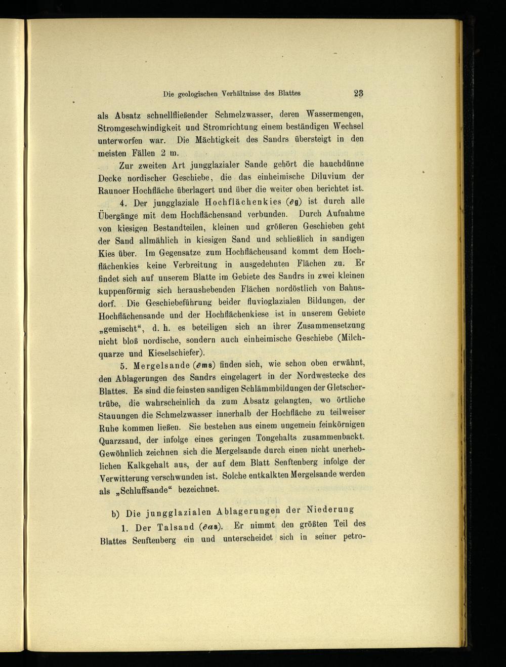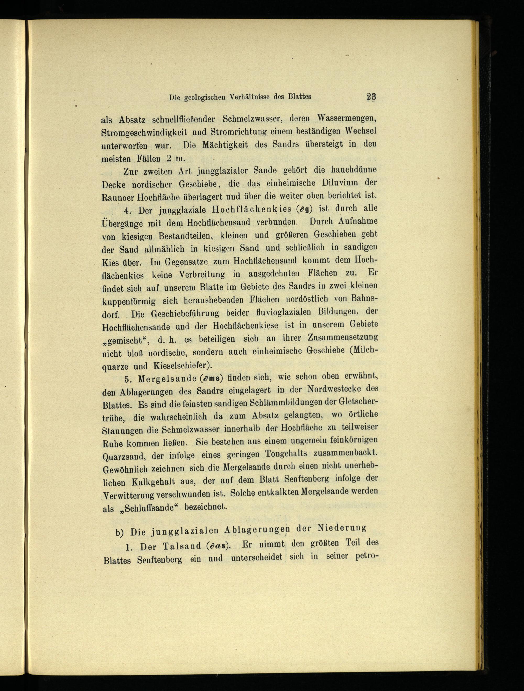 4. Der jungglaziale Hochflächenkies(ög) ist durch alle Übergänge mit dem Hochflächensand verbunden. Durch Aufnahme von kiesigen Bestandteilen, kleinen und größeren Geschieben geht der Sand allmählich in kiesigen Sand und schließlich in sandigen Kies über. Im Gegensatze zum Hochflächensand kommt dem Hochflächenkies keine Verbreitung in ausgedehnten Flächen zu. Kr findet sich auf unserem Blatte im Gebiete des Sandrs in zwei kleinen kuppenförmig sich heraushebenden Flächen nordöstlich von Bahns dorf .. Die Geschiebeführung beider fluvioglazialen Bildungen, der Hochflächensande und der Hochflächenkiese ist in unserem Gebiete „gemischt“, d.h. es beteiligen sich an ihrer Zusammensetzung nicht bloß nordische, sondern auch einheimische Geschiebe(Milchquarze und Kieselschiefer).