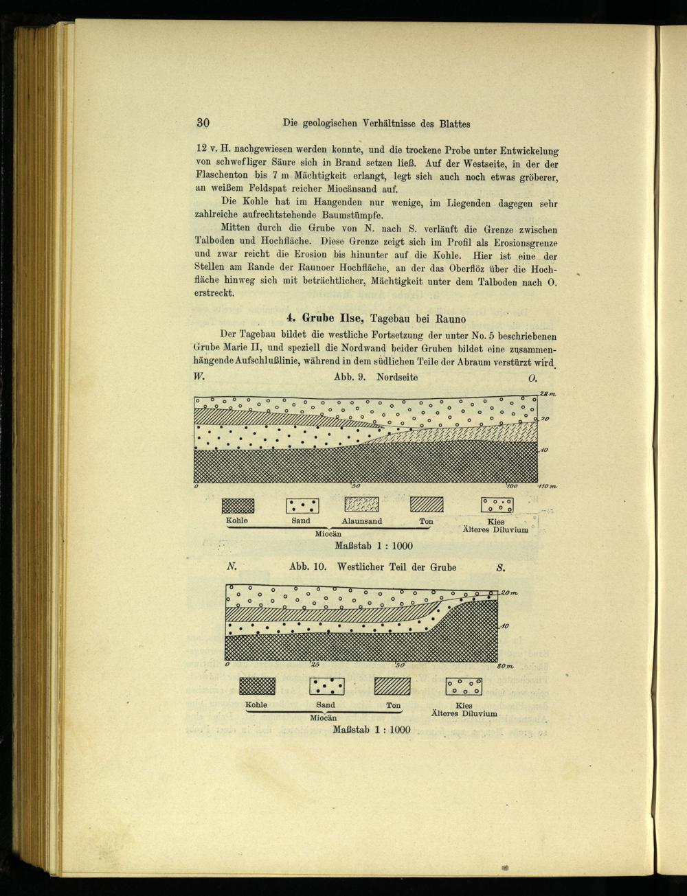 Mitten durch die Grube von N. nach S. verläuft die Grenze zwischen Talboden und Hochfläche. Diese Grenze zeigt sich im Profil als Erosionsgrenze und zwar reicht die Erosion bis hinunter auf. die Kohle. Hier ist eine der Stellen am Rande der Raunoer Hochfläche, an der das Oberflöz über die Hochfläche hinweg sich mit beträchtlicher, Mächtigkeit unter dem Talboden nach O. erstreckt.