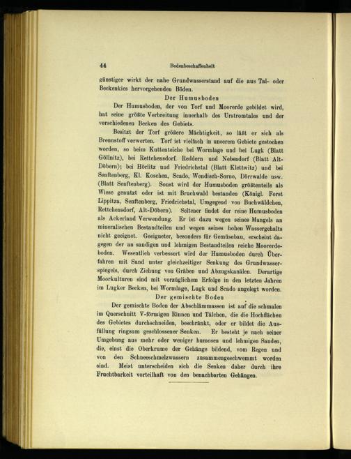 Besitzt der Torf größere Mächtigkeit, so läßt er sich als Brennstoff verwerten. Torf ist vielfach in unserem Gebiete gestochen worden, so beim Kuttenteiche bei Wormlage und bei Lugk(Blatt Göllnitz), bei Rettehensdorf. Reddern und Nebendorf(Blatt Alt Döbern ); bei Hörlitz und Friedrichstal (Blatt Klettwitz) und- bei Senftenberg , Kl. Koschen, Scado, Wendisch-Sorno, Dörrwalde usw. (Blatt Senftenberg ). Sonst wird der Humusboden größtenteils als Wiese genutzt oder ist mit Bruchwald bestanden(Königl. Forst Lippitza, Senftenberg , Friedrichstal , Umgegend von Buchwäldchen, Rettchensdorf, Alt-Döbern ). Seltener findet der reine Humusboden als Ackerland Verwendung. Er ist dazu wegen seines Mangels an mineralischen Bestandteilen und wegen seines hohen Wassergehalts nicht geeignet. Geeigneter, besonders für Gemüsebau, erscheint dagegen der an sandigen und lehmigen Bestandteilen reiche Moorerdeboden. Wesentlich verbessert wird der Humusboden durch Überfahren mit Sand unter gleichzeitiger Senkung des Grundwasserspiegels, durch Ziehung von Gräben und Abzugskanälen. Derartige Moorkulturen sind mit vorzüglichem Erfolge in den letzten Jahren im Lugker Becken, bei Wormlage, Lugk und Scado angelegt worden.