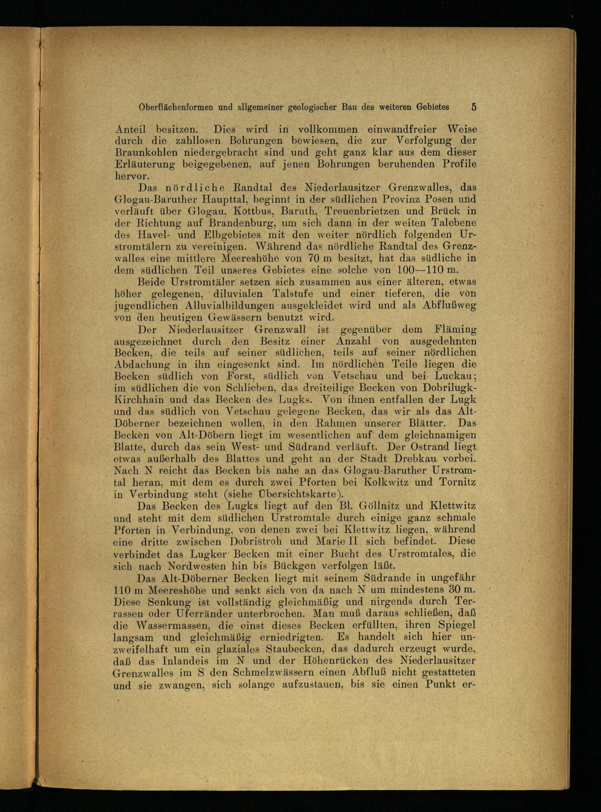 Der Niederlausitzer Grenzwall ist gegenüber dem Fläming ausgezeichnet durch den Besitz einer Anzahl von ausgedehnten Becken, die teils auf seiner südlichen, teils auf seiner nördlichen Abdachung in ihn eingesenkt sind. Im nördlichen Teile liegen die Becken südlich von Forst, südlich von Vetschau und bei Luckau ; im südlichen die von Schlieben , das dreiteilige Becken von DobrilugkKirchhain und das Becken des Lugks. Von“ihnen entfallen der Lugk und das südlich von Vetschau gelegene Becken, das wir als das AltDöberner bezeichnen wollen, in den Rahmen unserer Blätter. Das Becken von Alt-Döbern liegt im wesentlichen auf” dem gleichnamigen Blatte, durch das sein West- und Südrand verläuft. Der Ostrand liegt etwas außerhalb des Blattes und geht an der Stadt Drebkau vorbei. Nach N reicht das Becken bis nahe an das Glogau-Baruther Urstromtal heran, mit dem es durch zwei Pforten bei Kolkwitz und Tornitz in Verbindung steht(siehe Übersichtskarte).