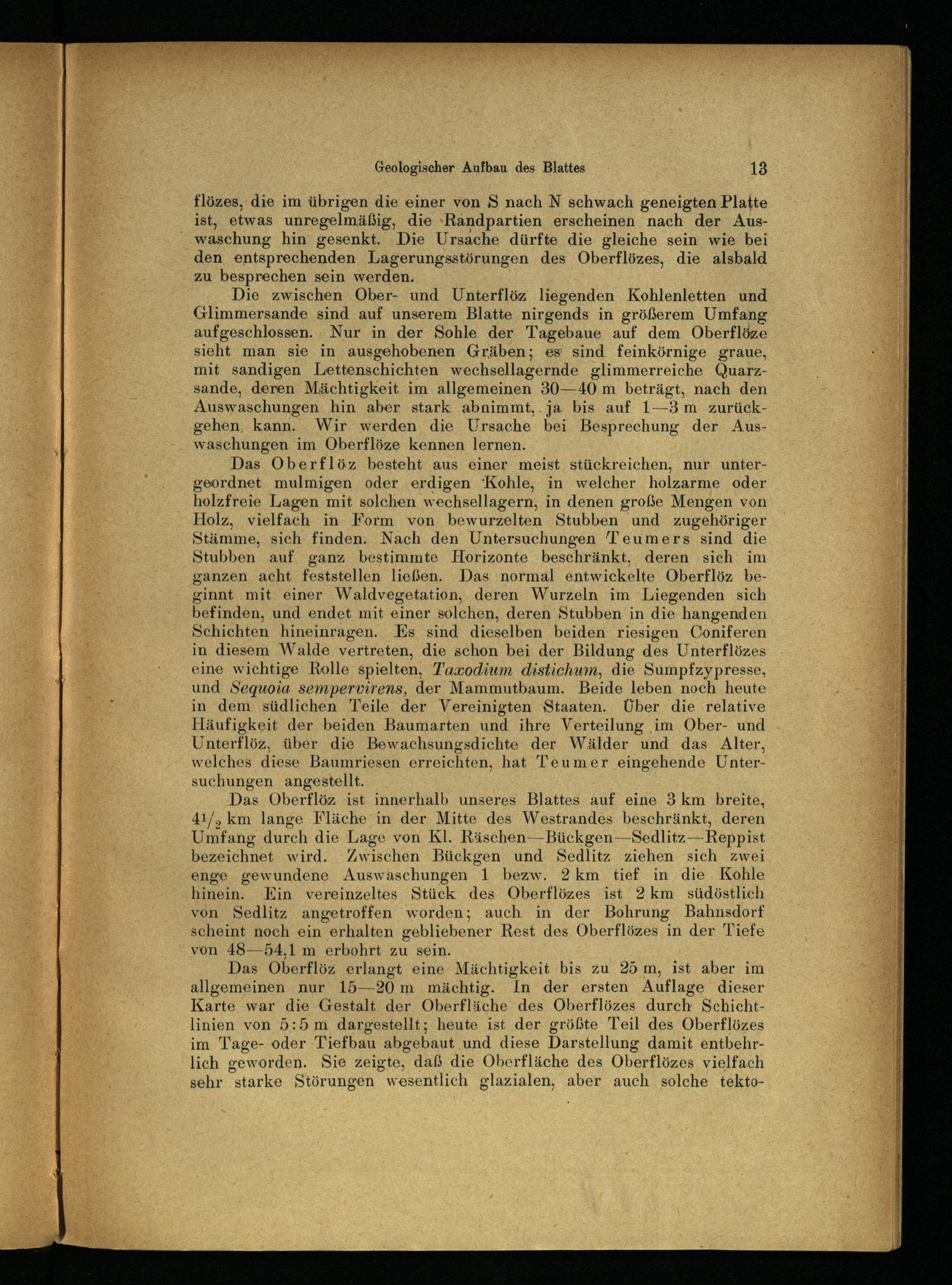 Das Oberflöz besteht aus einer meist stückreichen, nur untergeordnet mulmigen. oder erdigen‘Kohle, in welcher holzarme oder holzfreie Lagen mit solchen w echsellagern, in denen große Mengen von Holz, vielfach in Form von bewurzelten Stubben und zugehöriger Stämme, sich finden. Nach den Untersuchungen Teumers sind die Stubben auf ganz bestimmte Horizonte beschränkt, deren sich. im ganzen acht feststellen ließen. Das normal entwickelte Oberflöz beginnt mit. einer Waldvegetation, deren Wurzeln im Liegenden sich befinden, und endet mit einer solchen, deren Stubben in die hangenden Schichten hineinragen. Es sind dieselben beiden riesigen Coniferen in diesem Walde vertreten, die schon bei der Bildung des Unterflözes eine wichtige Rolle spielten, Taxodium distichum, die Sumpfzypresse, und Sequoia sempervirens , der Mammutbaum. Beide leben noch heute in dem südlichen Teile der Vereinigten Staaten . Über die relative Häufigkeit der beiden Baumarten und ihre Verteilung im Ober- und Unterflöz, über die Bewachsungsdichte der Wälder und das Alter, welches diese Baumriesen erreichten, hat Teumer eingehende Untersuchungen angestellt.