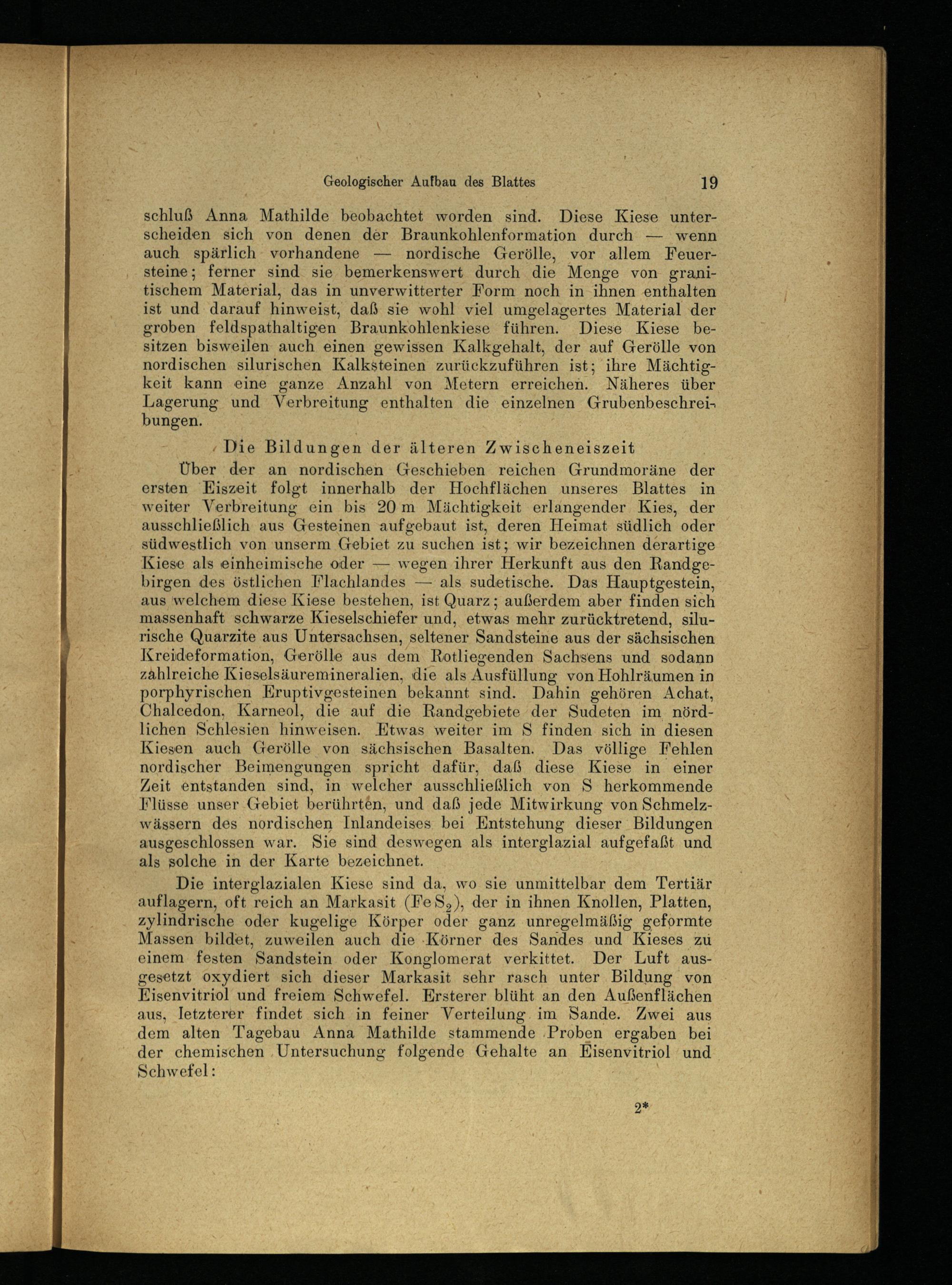 Die interglazialen Kiese sind da, wo sie unmittelbar dem Tertiär auflagern, oft reich an Markasit(FeS,), der in ihnen Knollen, Platten, zylindrische oder kugelige Körper oder ganz unregelmäßig geformte Massen bildet, zuweilen auch die ‚Körner des Sandes und Kieses zu einem festen Sandstein. oder Konglomerat verkittet. Der Luft ausgesetzt oxydiert sich dieser Markasit sehr rasch unter Bildung von Kisenvitriol und freiem Schwefel. Ersterer blüht an den Außenflächen aus, Jetzterer findet sich in feiner Verteilung. im Sande. Zwei aus dem alten Tagebau Anna Mathilde stammende ‚Proben ergaben bei der chemischen ‚Untersuchung folgende Gehalte an Kisenvitriol und