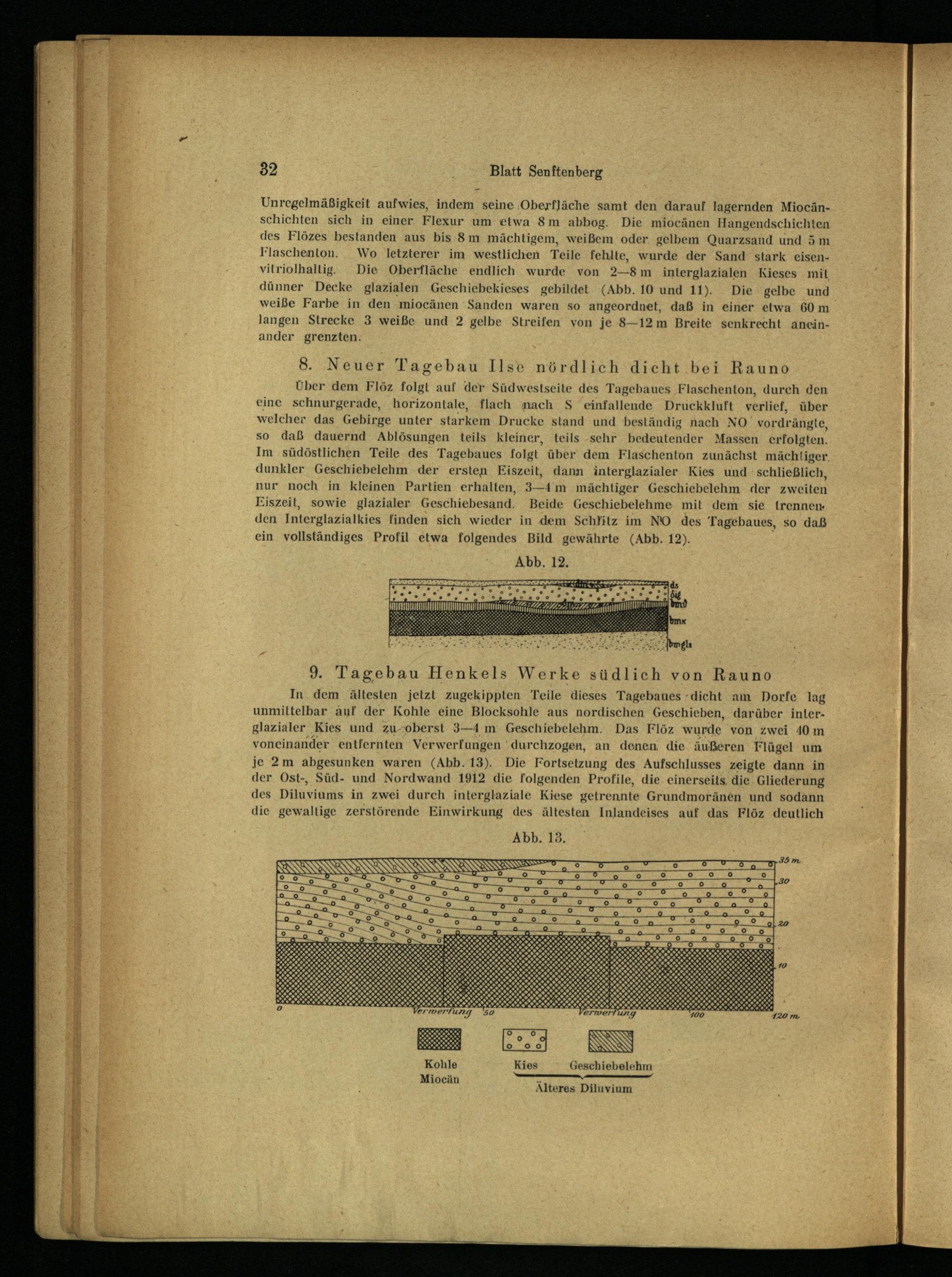 32) Blatt Senftenberg Unregelmäßigkeit aufwies, indem seine ‚Oberfläche samt den darauf lagernden Miocänschichten sich in einer Flexur um etwa 8m abbog. Die miocänen Hangendschichten des Flözes bestanden aus bis 8 m mächtigem, weißem oder gelbem Quarzsand und 5m Tlaschenton. Wo letzterer im westlichen Teile fehlte, wurde der Sand stark eisenvitriolhaltig. Die Oberfläche endlich wurde von 2—8m interglazialen Kieses mit dünner Decke glazialen Geschiebekieses gebildet(Abb. 10 und 11). Die gelbe und weiße Farbe in den miocänen Sanden waren so angeordnet, daß in einer etwa 60m langen Strecke 3 weiße und 2 gelbe Streifen von je 8—12m Breite senkrecht aneinander grenzten.