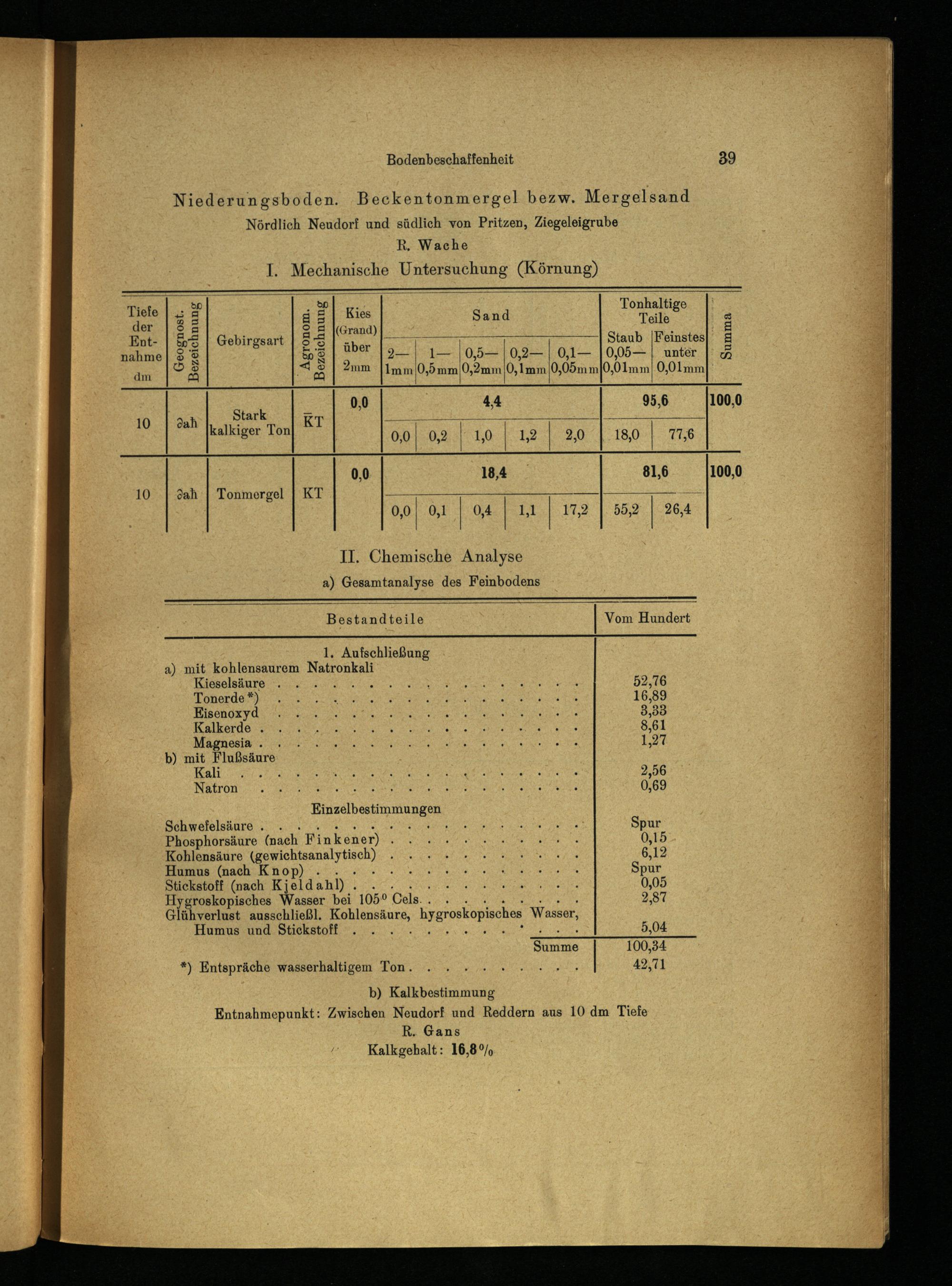 Schwefelsäure.. Spur Phosphorsäure(nach Finkener). 0,15 Kohlensäure(gewichtsanalytisch) 6,12 Humus(nach Knop) EN Oak Spur Stickstoff(nach K jeldahl). WE 0,05 Hygroskopisches Wasser bei 1050 Cels.. 2,87