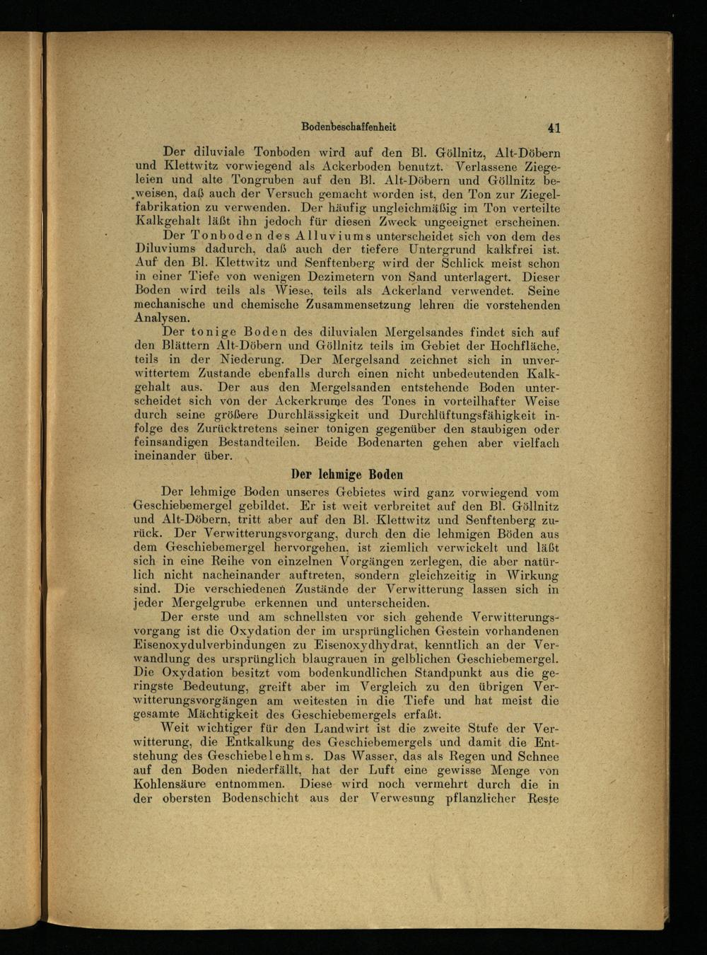 Der lehmige Boden’ unseres Gebietes wird ganz vorwiegend vom Geschiebemergel gebildet. Er ist weit verbreitet auf den Bl. Göllnitz und Alt-Döbern, tritt aber auf den Bl. Klettwitz und Senftenberg zurück. Der Verwitterungsvorgang, durch den die lehmigen Böden aus dem Geschiebemergel hervorgehen, ist ziemlich verwickelt und läßt sich in eine Reihe von einzelnen Vorgängen zerlegen, die aber natürlich nicht nacheinander auftreten, sondern gleichzeitig in Wirkung sind. Die verschiedenen Zustände der Verwitterung lassen sich in jeder Mergelgrube erkennen und unterscheiden.