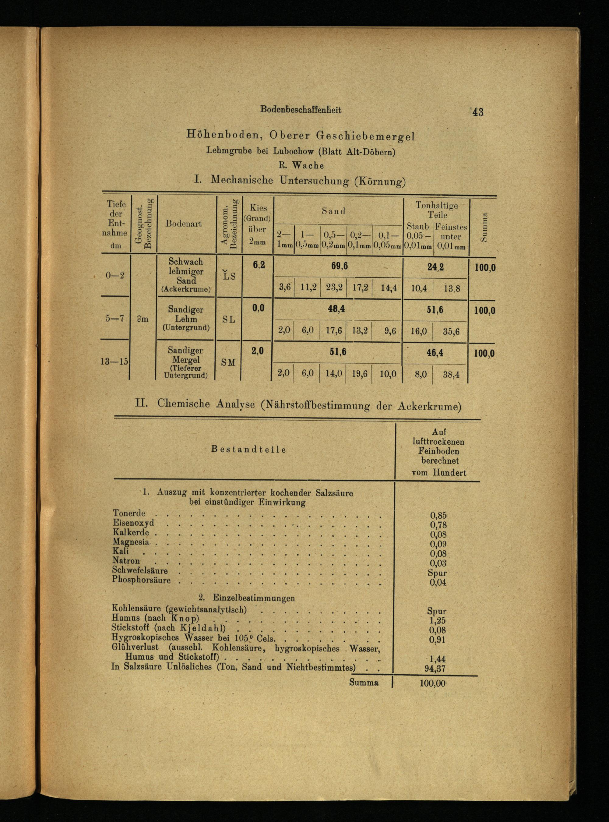Humus und Stickstoff).. RE‘1,44 In Salzsäure Unlösliches(Ton, Sand und"Nichtbestimmtes) x. 94,37