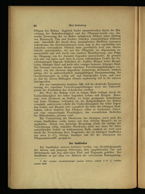Der Wert des Bodens wird in hohem Maße bedingt durch die Undurchlässigkeit des tiefer liegenden Lehms und Mergels. Einerseits wird hierdurch an Stellen, wo keine genügende Ackerkrume und keine Drainage vorhanden ist, die Kaltgründigkeit des Bodens veranlaßt, andererseits erhöht die Undurchlässigkeit les tiefer liegenden Lehms und Mergels sehr. w esentlich die Güte des lehmigen Sand: bodens, sofern dadurch den Pflanzen selbst in trockenster Jahreszeit eine entsprechende Feuchtigkeit, das wesentlichste Bedürfnis des Höhenbodens, geboten wird.