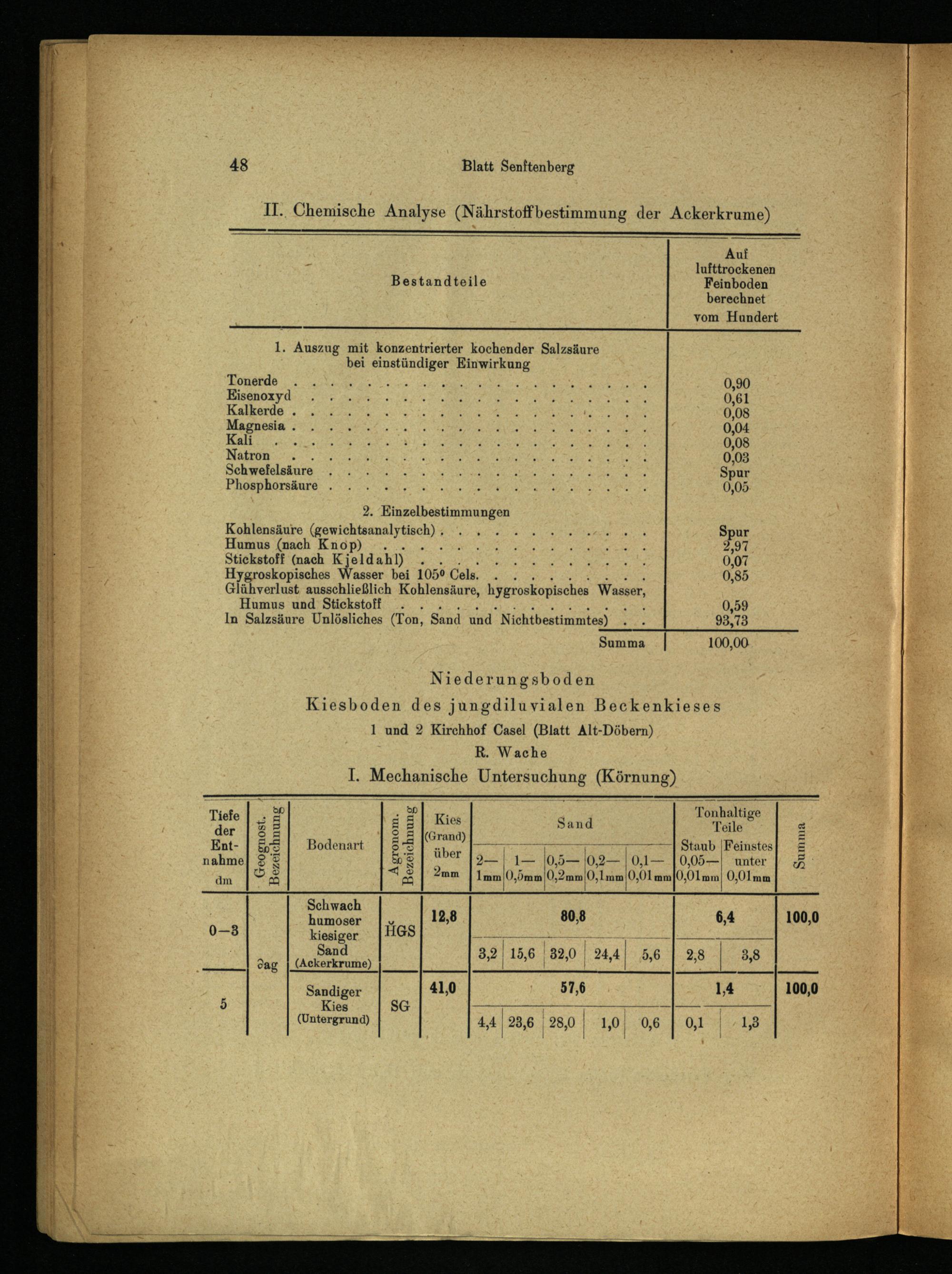 Niederungsboden Kiesboden des jungdiluvialen Beckenkieses 1 und 2 Kirchhof Casel(Blatt Alt-Döbern) R. Wache I. Mechanische Untersuchung(Körnung)