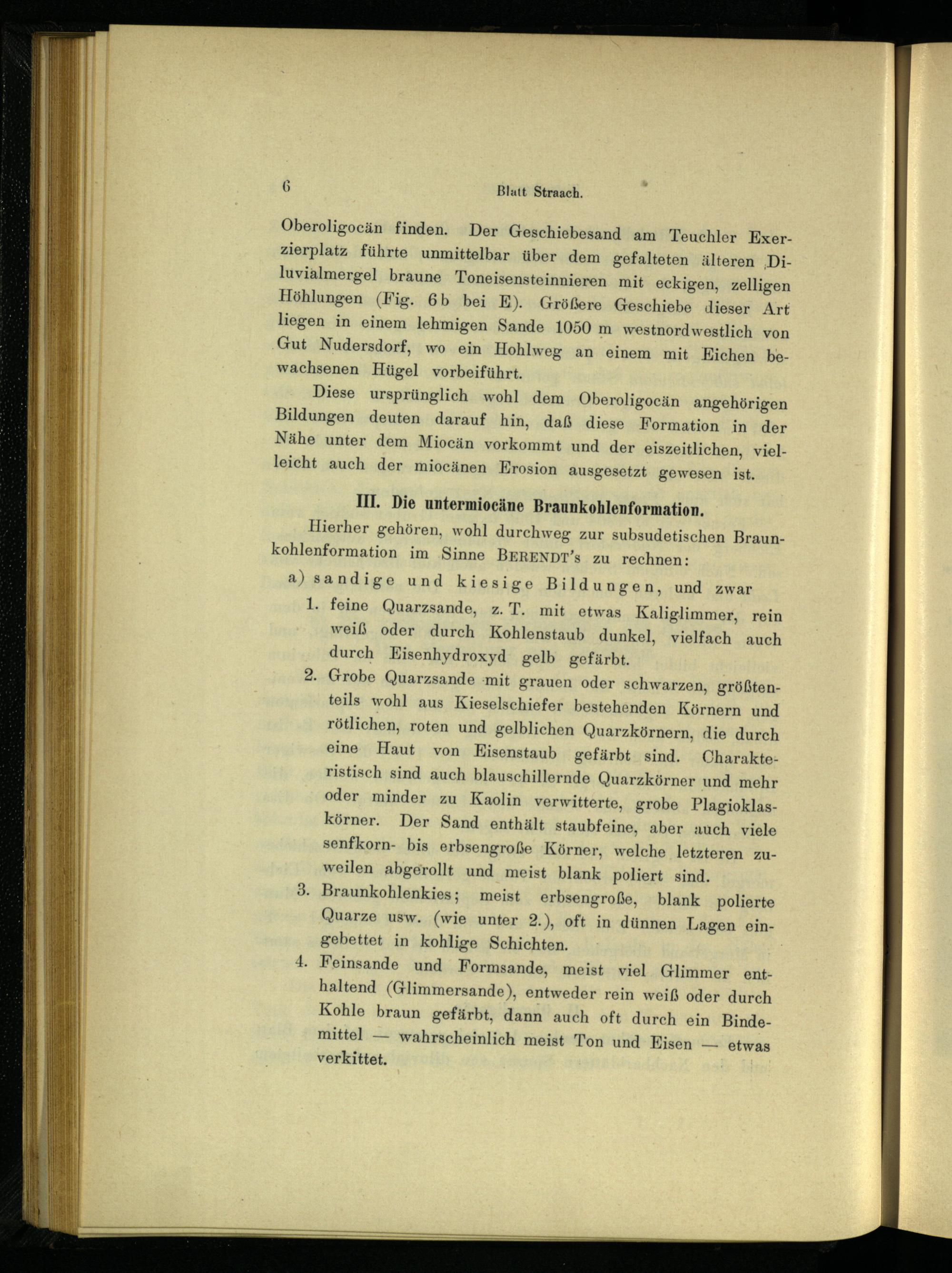 III. Die untermiocäne Braunkohlenformation. Hierher gehören, wohl durchweg zur subsudetischen Braunkohlenformation im Sinne BERENDT’s zu rechnen: a) sandige und kiesige Bildungen, und zwar 1. feine Quarzsande, z. T.. mit etwas Kaliglimmer, rein weiß oder durch Kohlenstaub dunkel, vielfach auch durch Eisenhydroxyd gelb gefärbt.